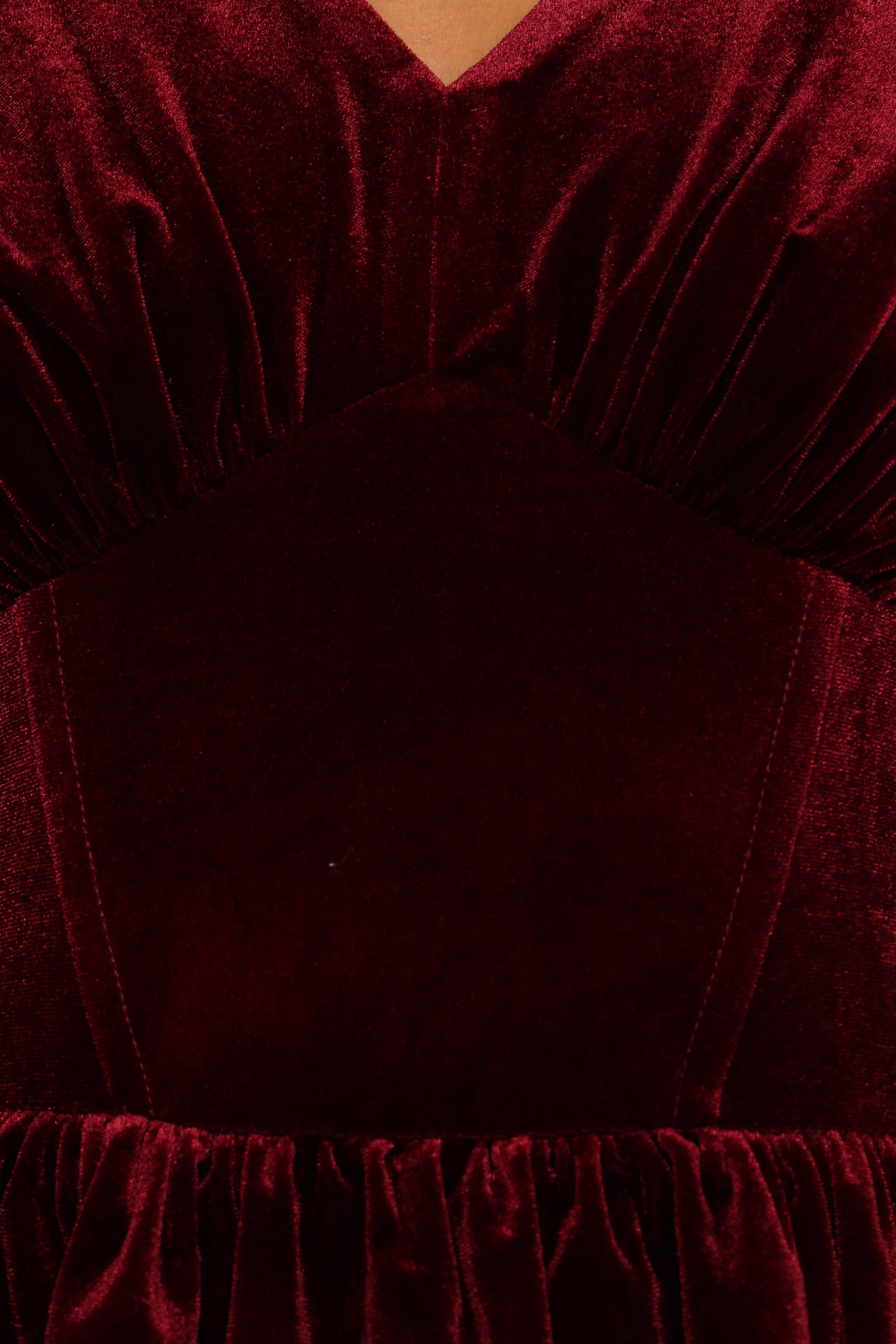 DETAILS Experience elegance with a twist in the Agnes Mini Dress - Wine. This captivating mini dress combines sophistication and playfulness with its luxurious soft velvet finish and stunning drop tiered ruffle skirt. The v neckline and short ruffle sleeves add a subtle allure, making it perfect for evening soires or a stylish night out.