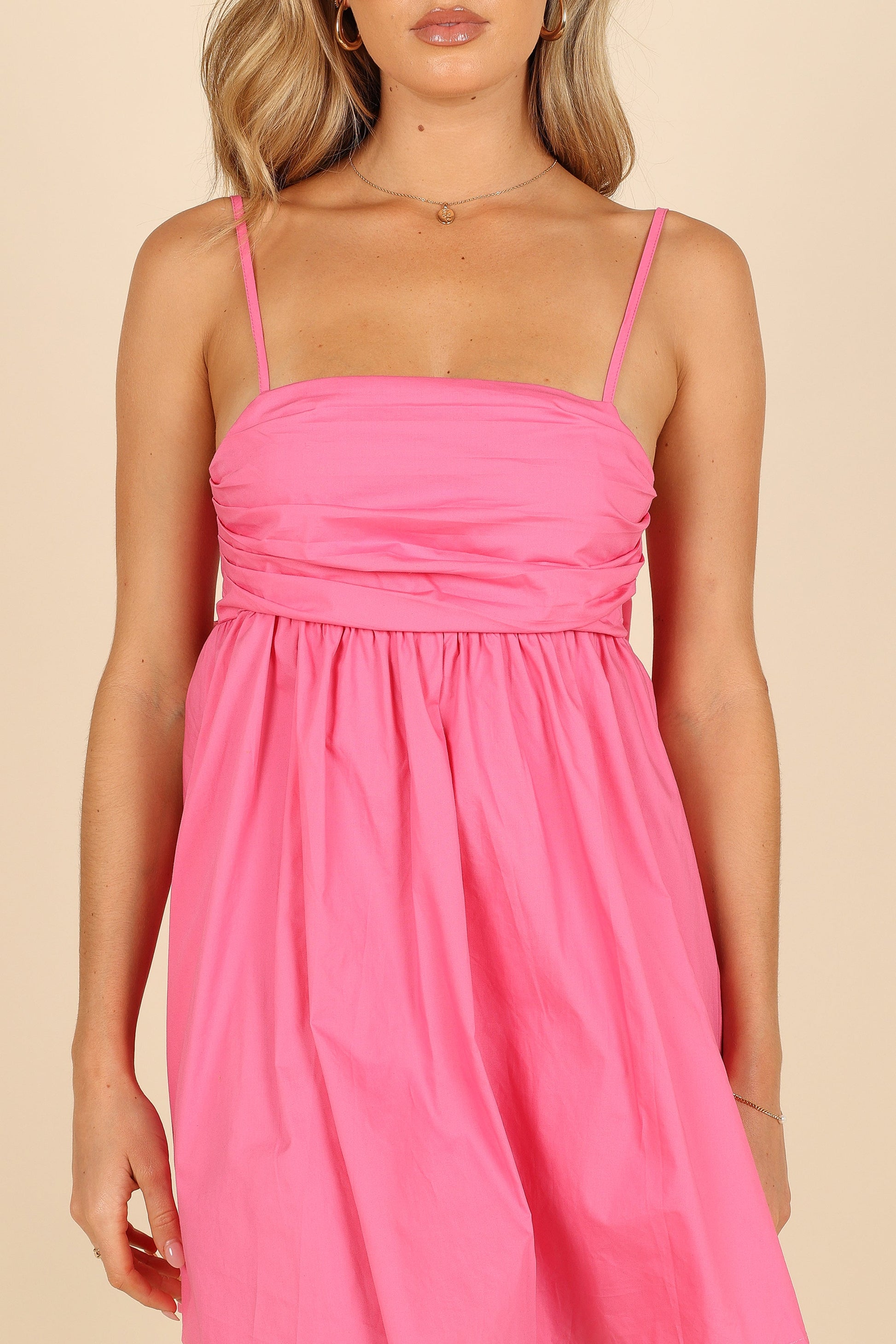 DETAILS This flirty and feminine mini dress is sure to make heads turn. Crafted with a babydoll silhouette, this above-the-knee length dress features a straight neckline, thin adjustable straps and a ruched bust detail for extra oomph.
