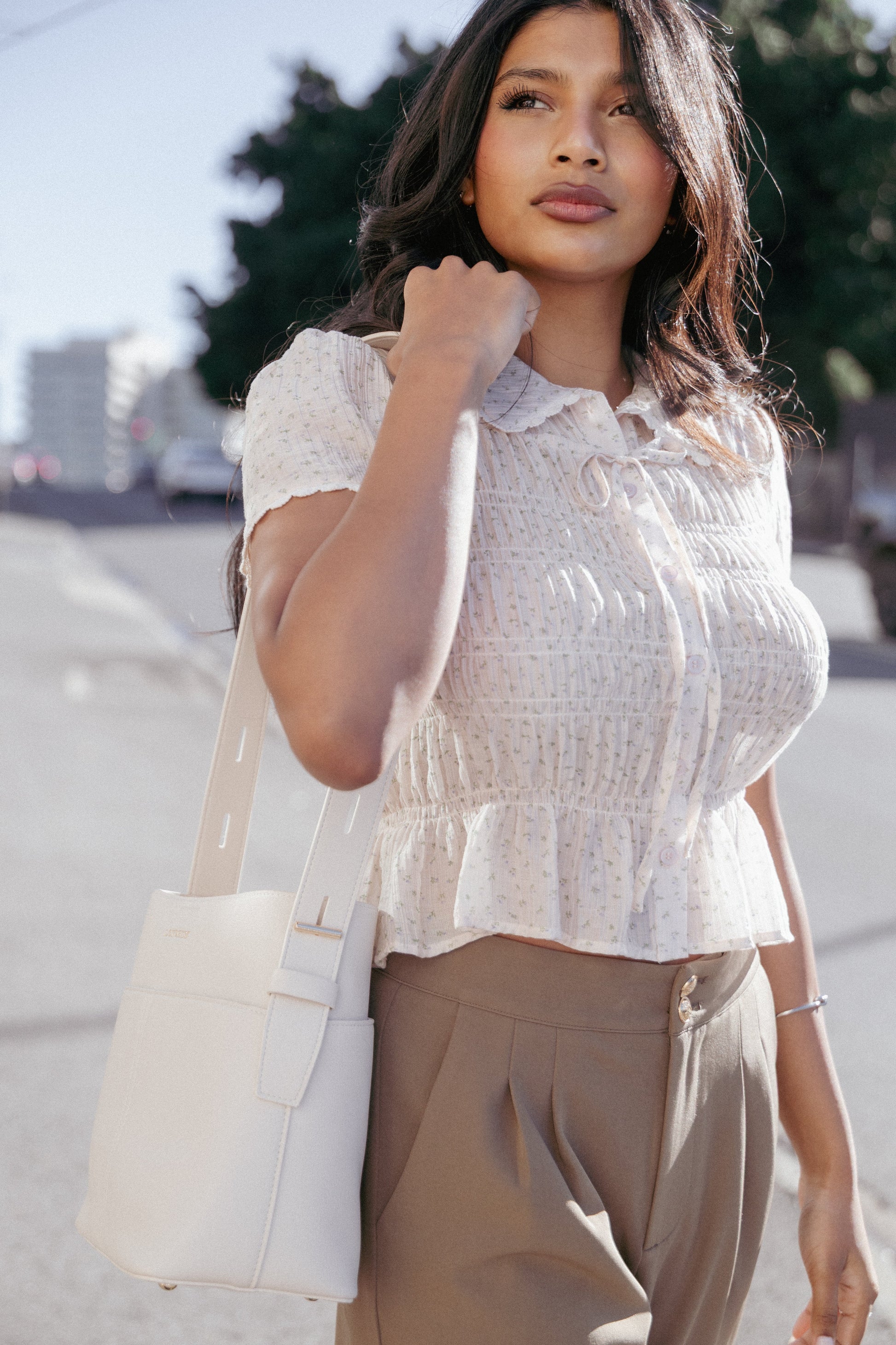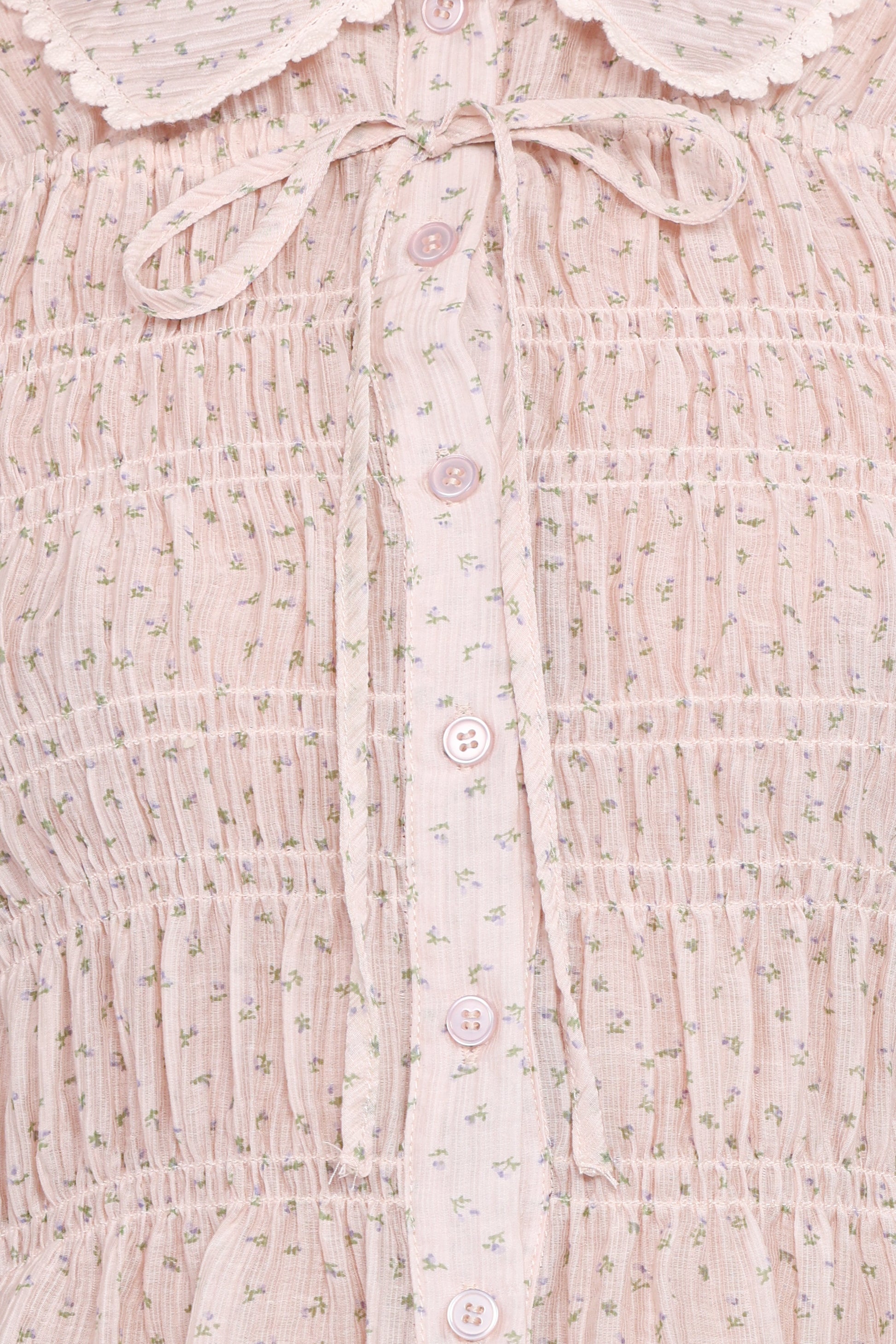 DETAILS Add a pop of color and charm to your wardrobe with the Alima Shirred Top in Pink Purple Floral. Featuring a feminine spread collar and short sleeves, this top brings effortless style to any outfit.