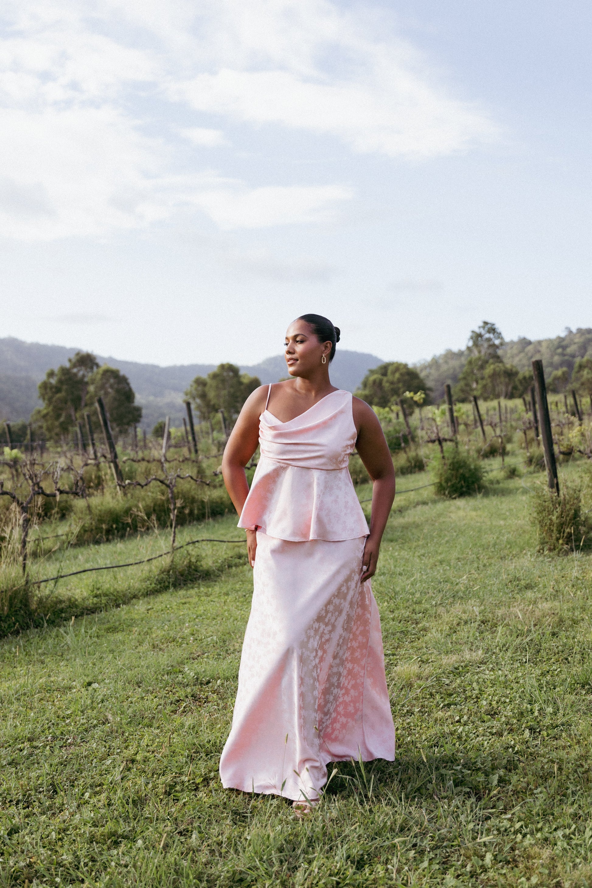 DETAILS Step into effortless elegance with the Alysa Skirt Set in Blush. Featuring a sleeveless cowl neck top with an adjustable tie-back and an elasticized fit, it pairs perfectly with the maxi-length skirt adorned with delicate floral detailing. Complete with an invisible side zip for a seamless look, it's versatile for any occasion.