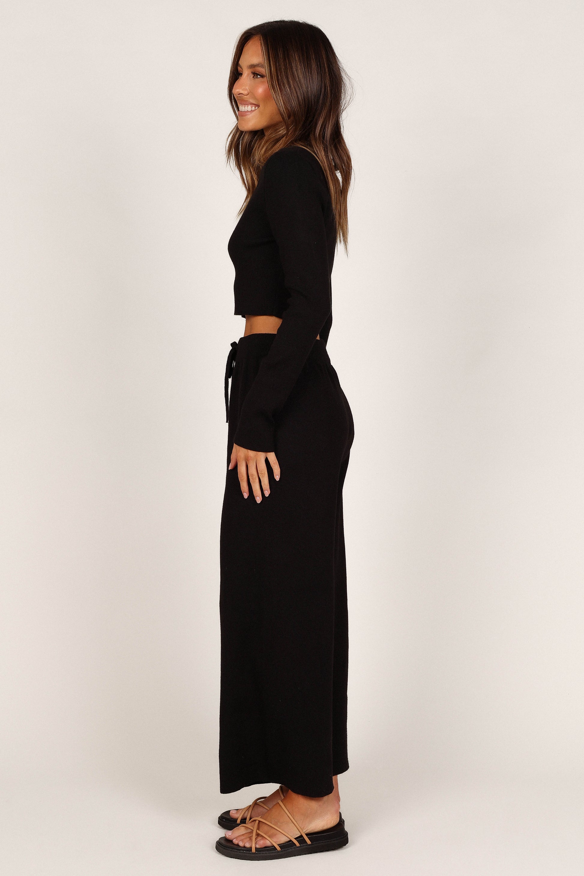 DETAILS This cozy top and pant set is a must-have for your weekend wardrobe! Crafted in a stretch ribbed fabric, the cropped length top features a round neckline and long sleeves while the high waisted pants feature an elasticised waistband with drawstring tie and wide leg style.