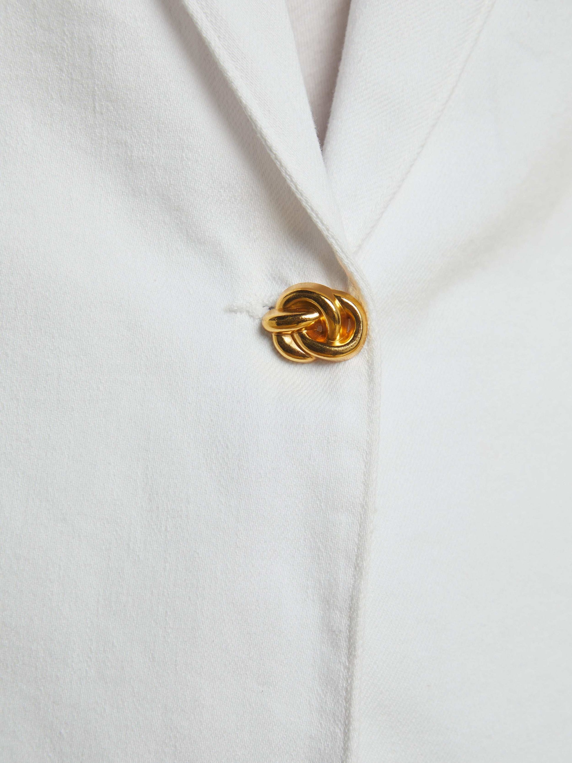 Our classic single-breasted blazer is now back in white denim with an antique knot button.