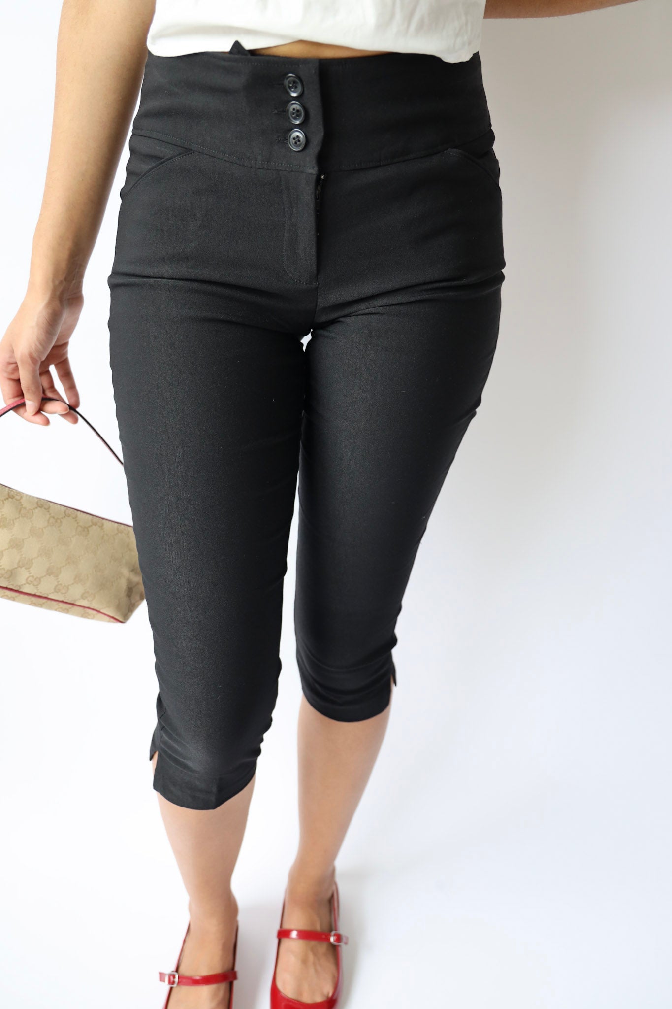 Get the perfect mix of city chic and casual cool with our Black Capri Trousers. The trouser style design and naturally stretchy fabric provide a snug yet comfortable fit, while the triple button fly and zipper add a touch of sophistication. Complete with faux side and back pockets, pair these with cute ballet flats for a y2k look. Perfect for a night out or everyday wear!