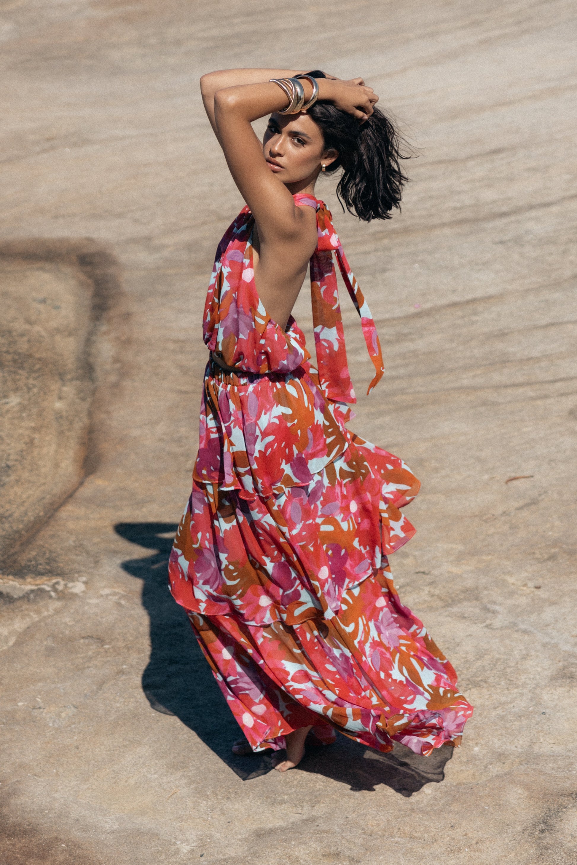 DETAILS This maxi length skirt is perfect for creating an elegant look. It features a high waisted style with an elasticised waistband for maximum comfort. The drop tiered design gives it a flattering silhouette, and the pink floral print adds a delicate touch of femininity.