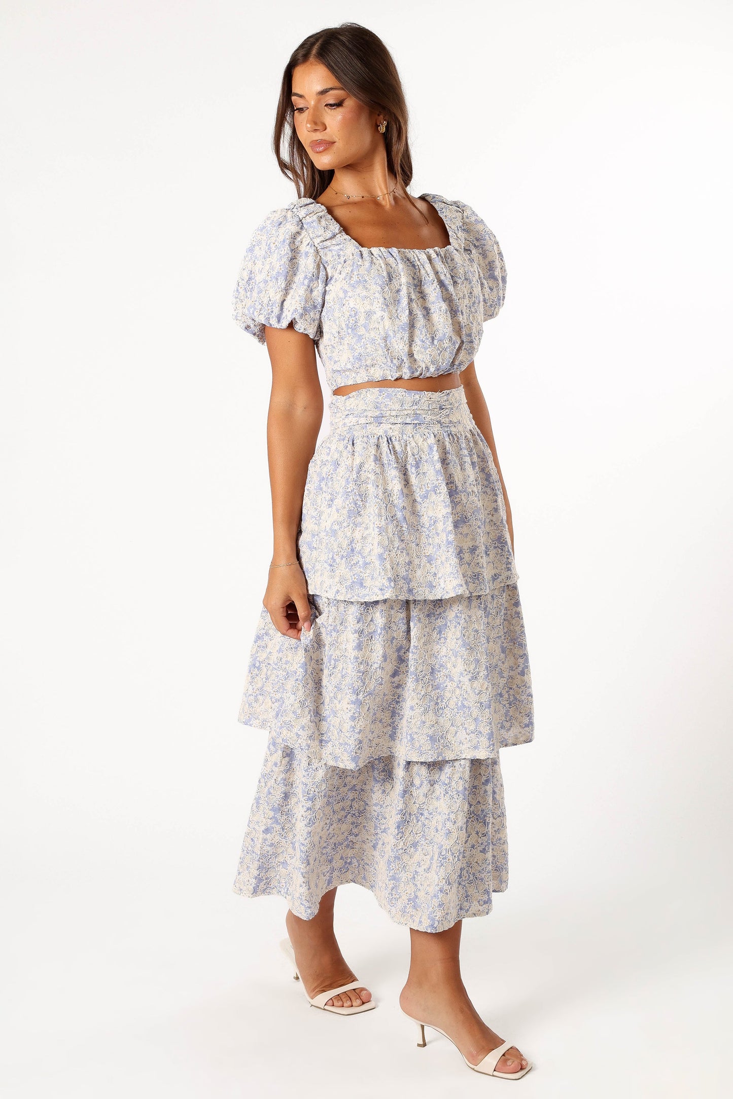 DETAILS This playful ensemble features a cropped top with a timeless square neckline, accented by short sleeves with whimsical elasticised cuffs. An elasticised shirred back panel ensures the top fits as beautifully as it looks. The set showcases a high-waisted, midi-length skirt that flows gracefully with every step, thanks to its gathered pleats and tiered ruffle design.