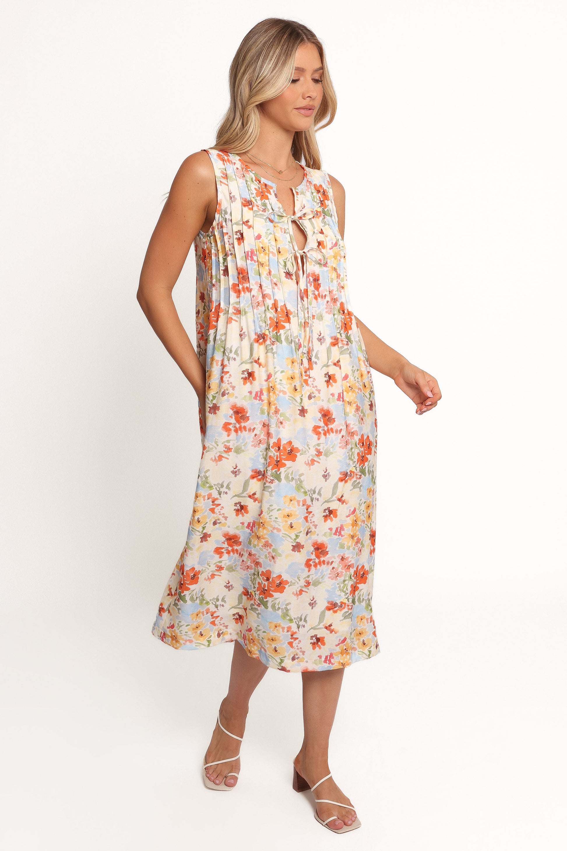 DETAILS Featuring a relaxed fit and a midi length, this dress is as comfortable as it is chic. The v-neckline with a delicate tie-close detail adds just the right touch of sophistication, while the soft pleated accents create a flowing silhouette that moves with you.