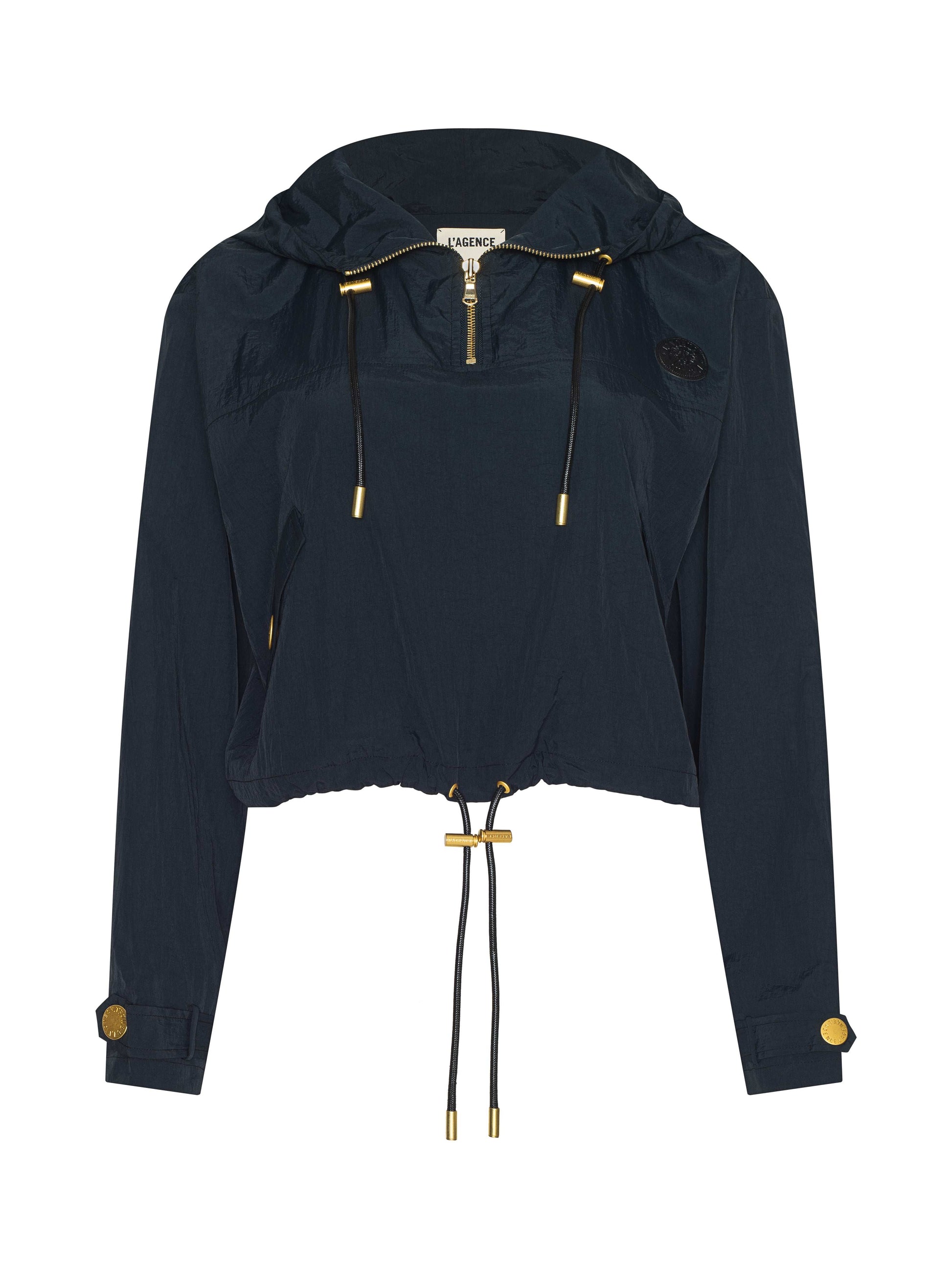 Sporty yet polished, the Bronwyn is an elevated windbreaker for everyday ease. A cropped silhouette, gold snaps, and adjustable drawstrings blend function and style.