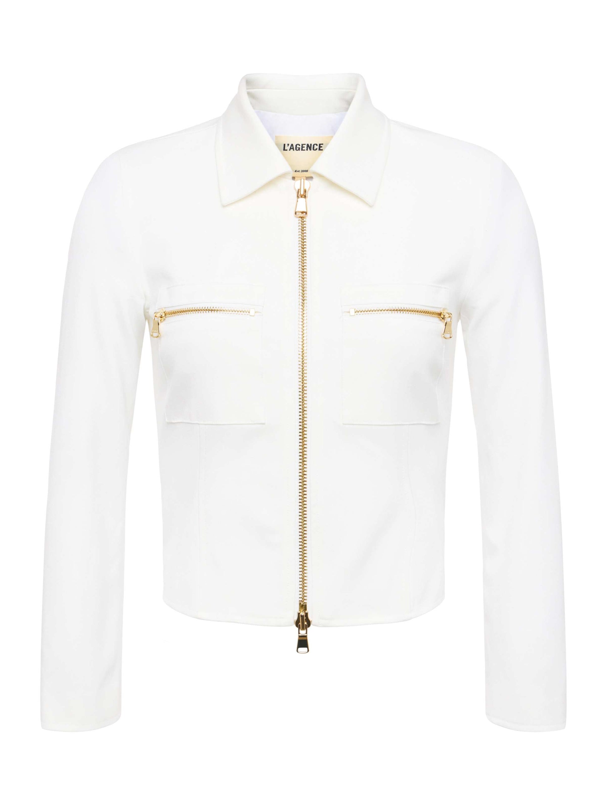 The Calianna is a crisp white shirt jacket, elevated with gold zip detailing for contrast and edge. Wear the Calinna on its own as a top with your favorite jeans or size up to wear it as a jacket over a camisole.
