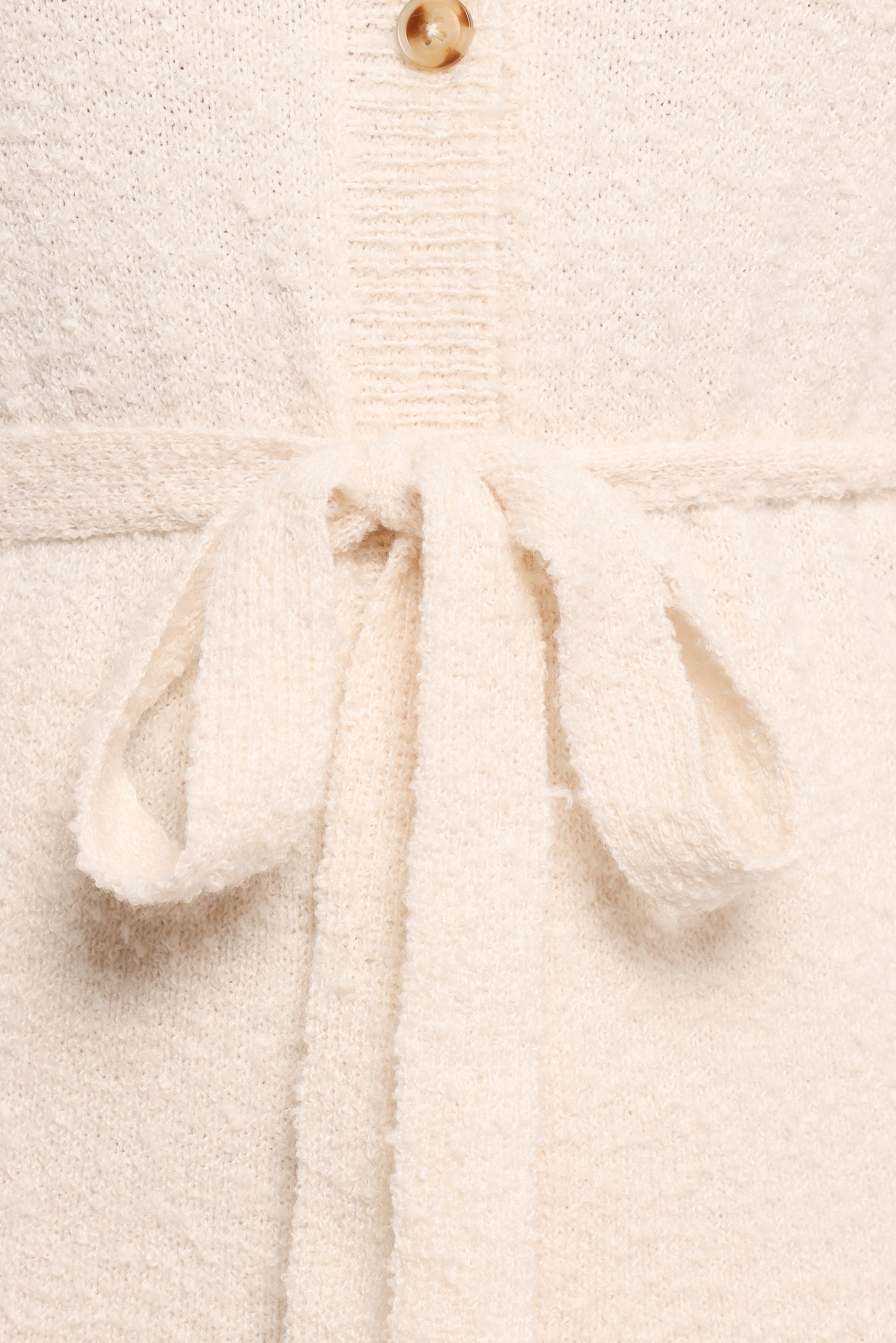 DETAILS This beautifully crafted piece features a chic round neckline and long sleeves, perfect for layering or wearing solo. The front is adorned with functional buttons, offering both practicality and style, while belt loops and a detachable waist tie allow you to cinch the cardigan for a flattering, tailored look.