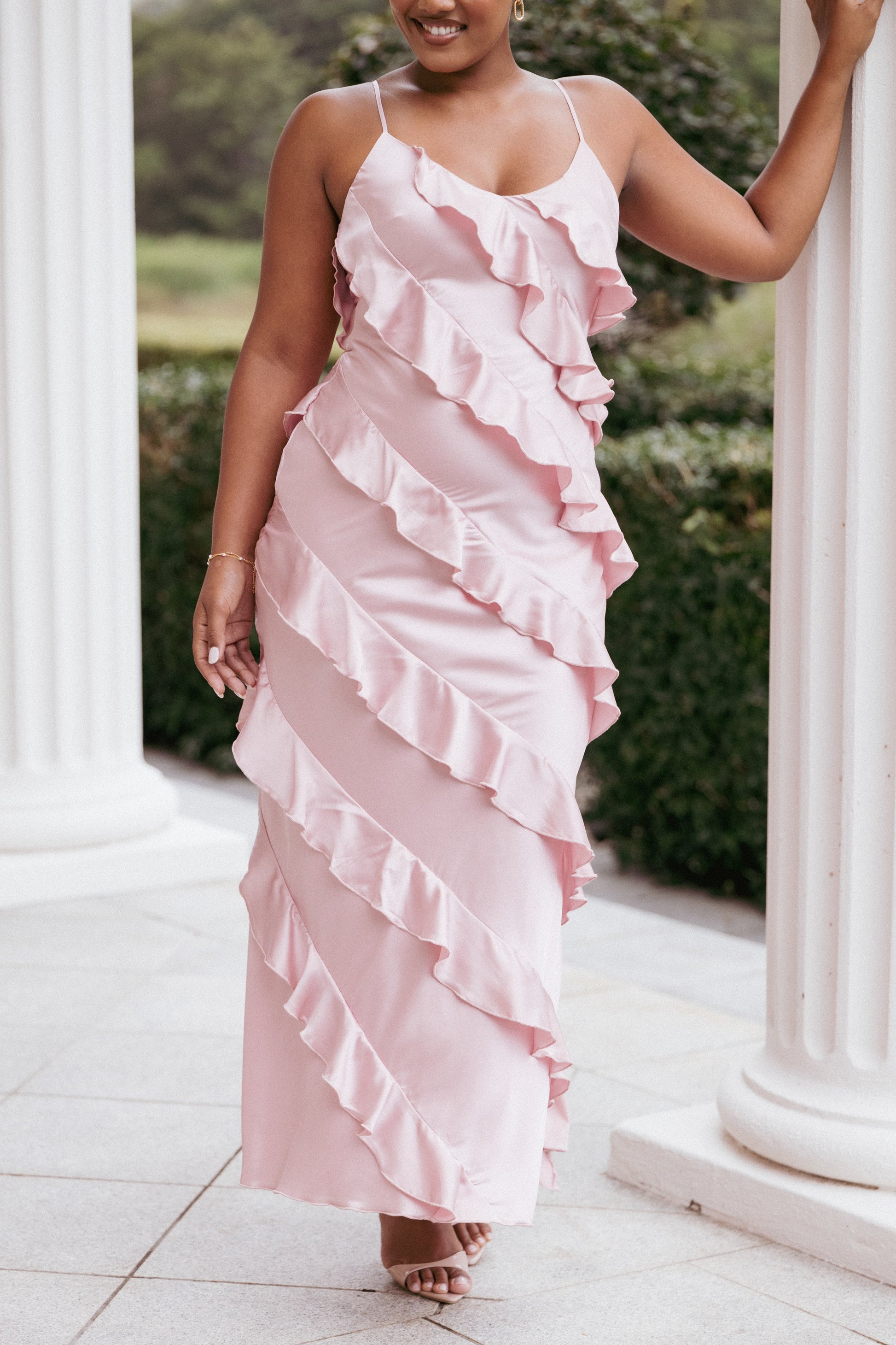 Ciao Ruffles Maxi Satin Dress - Pink