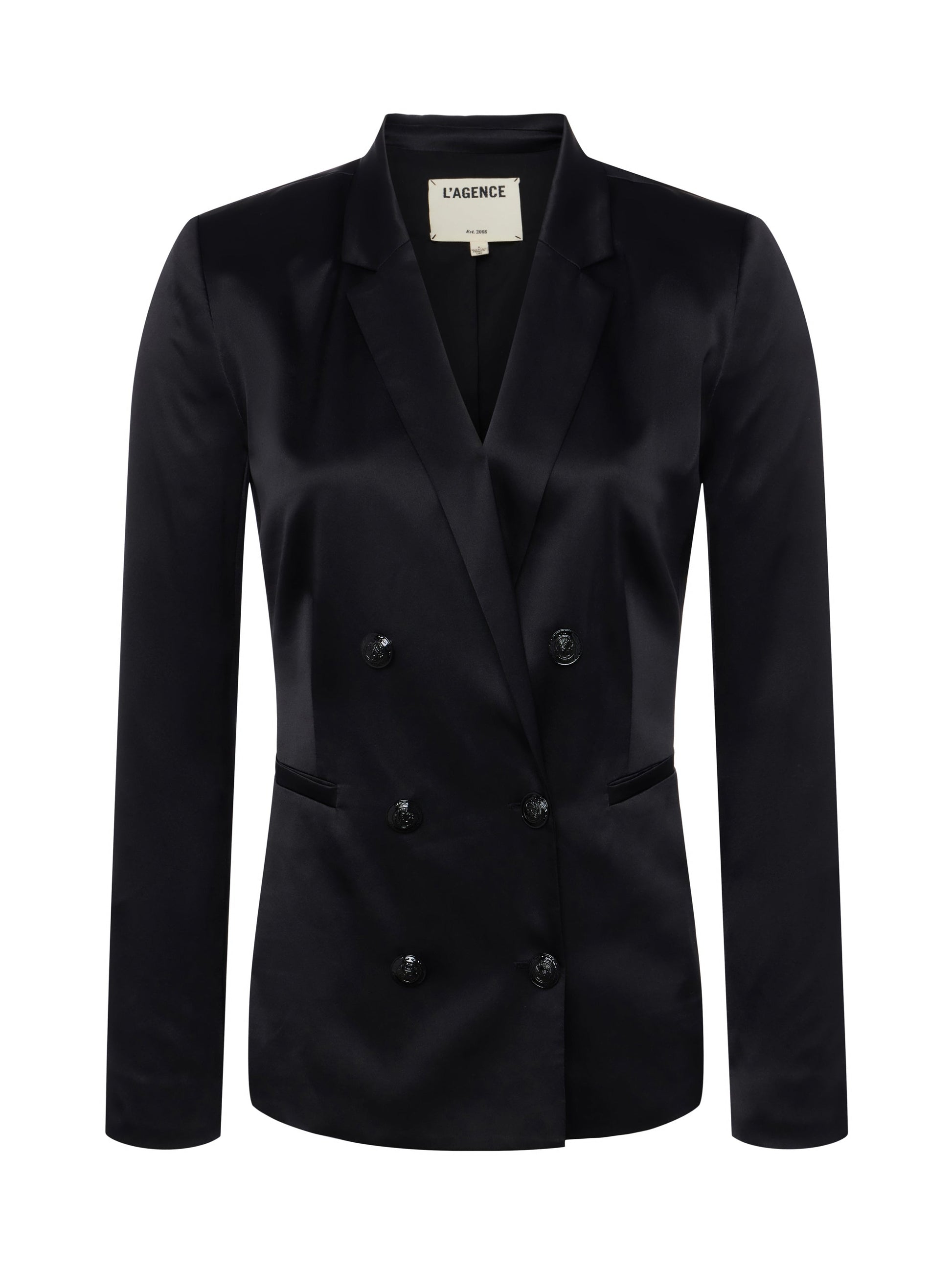 A timeless double-breasted blazer in black silk charmeuse. The fully lined Colin blazer offers tailored appeal with strong shoulders, sleek lapels, and welt pockets. Fastens in front with lustrous embossed-dome buttons. Complete your power suit by pairing with the coordinating Gavin pant.