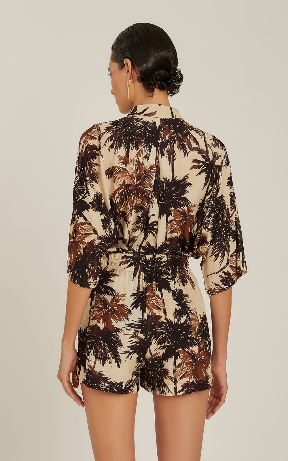 CORUMBAÚ: A watercolor landscape inspired by the beaches of Bahia, the Corumbaú print has a background of natural linen and coconut trees in shades of black and coffee.
