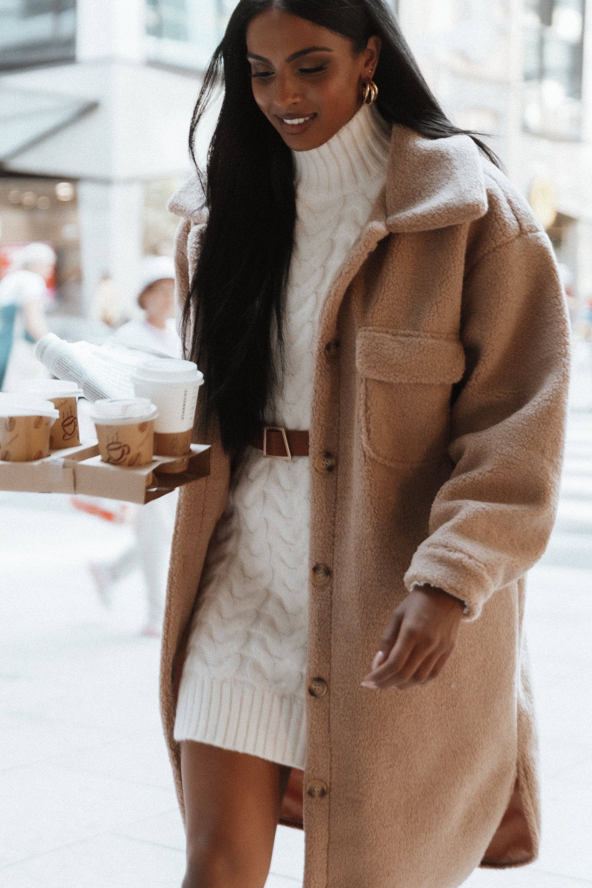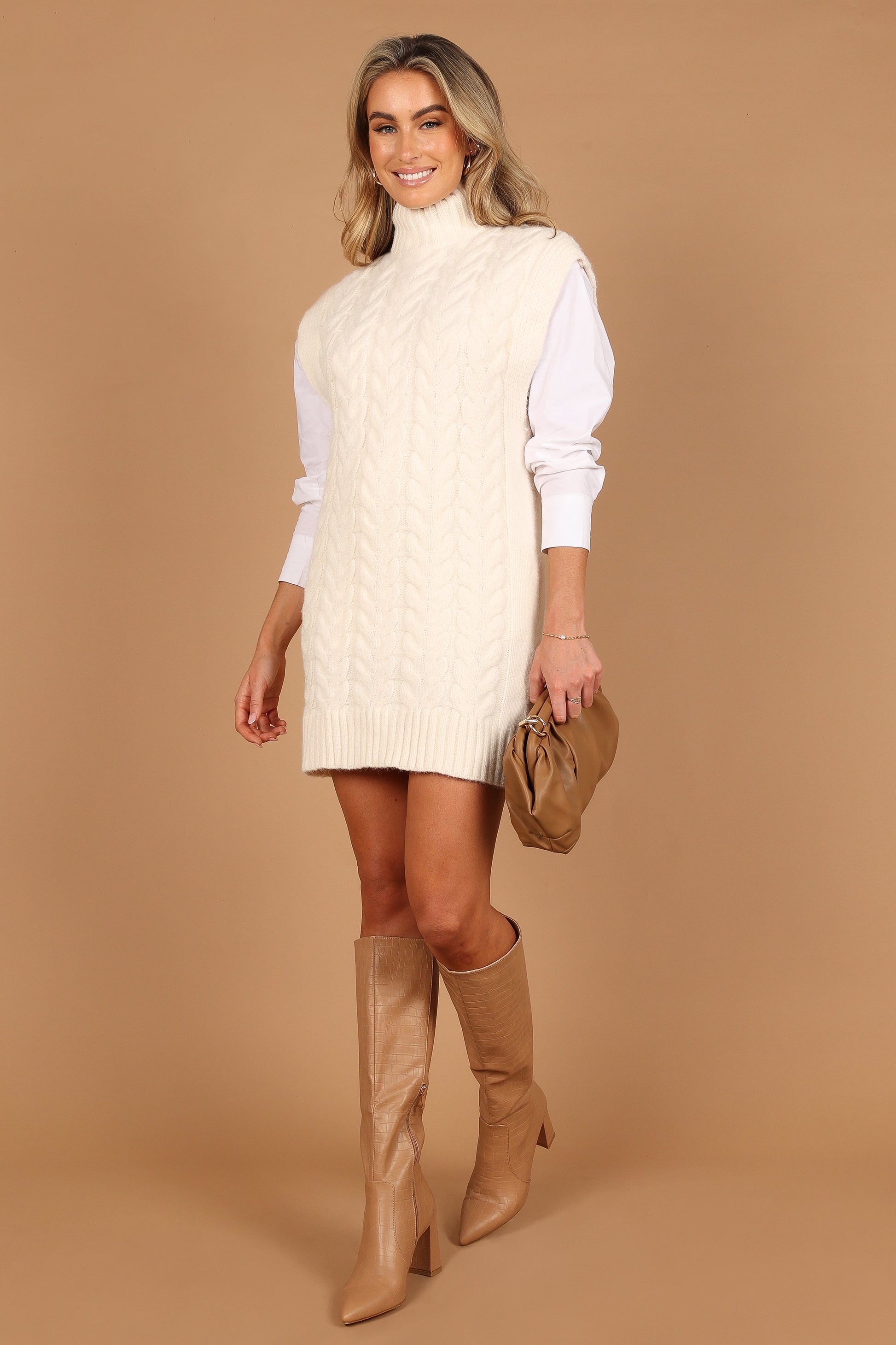 DETAILS Step into your cooler days in style in our Cozette Dress. This cream, cable-knit design offers a cozy yet relaxed fit. Its high turtleneck and ribbed hem, falling just above the knee, will keep you warm and stylish throughout the day.