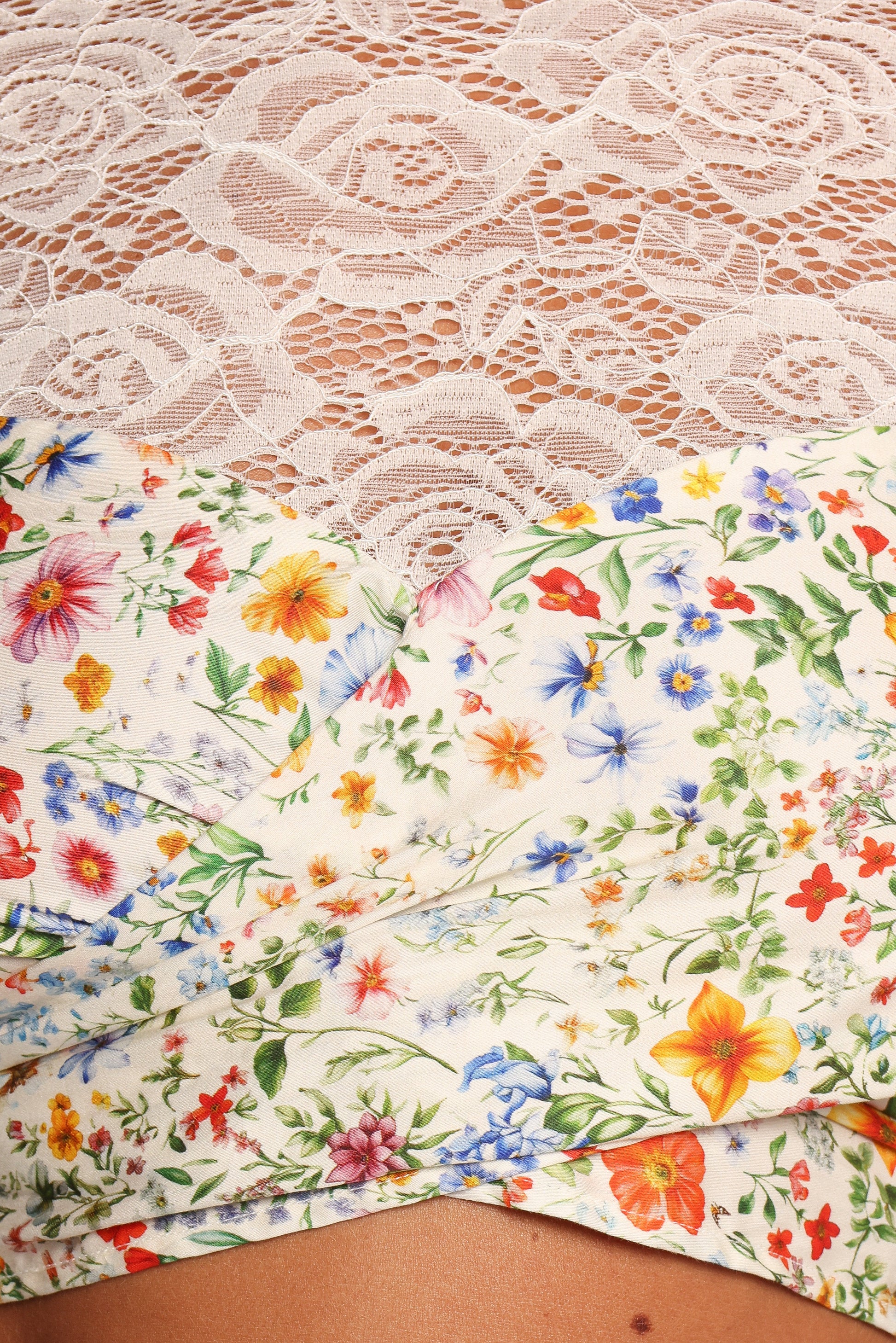 DETAILS Effortlessly elevate your wardrobe with the Dara Top - Garden Floral. Its cropped design and delicate lace sleeves bring a chic, romantic vibe, while the floral print keeps things fresh and feminine. Featuring a wrap tie for customizable styling and an invisible back zip, this top offers the perfect blend of sophistication and comfort.