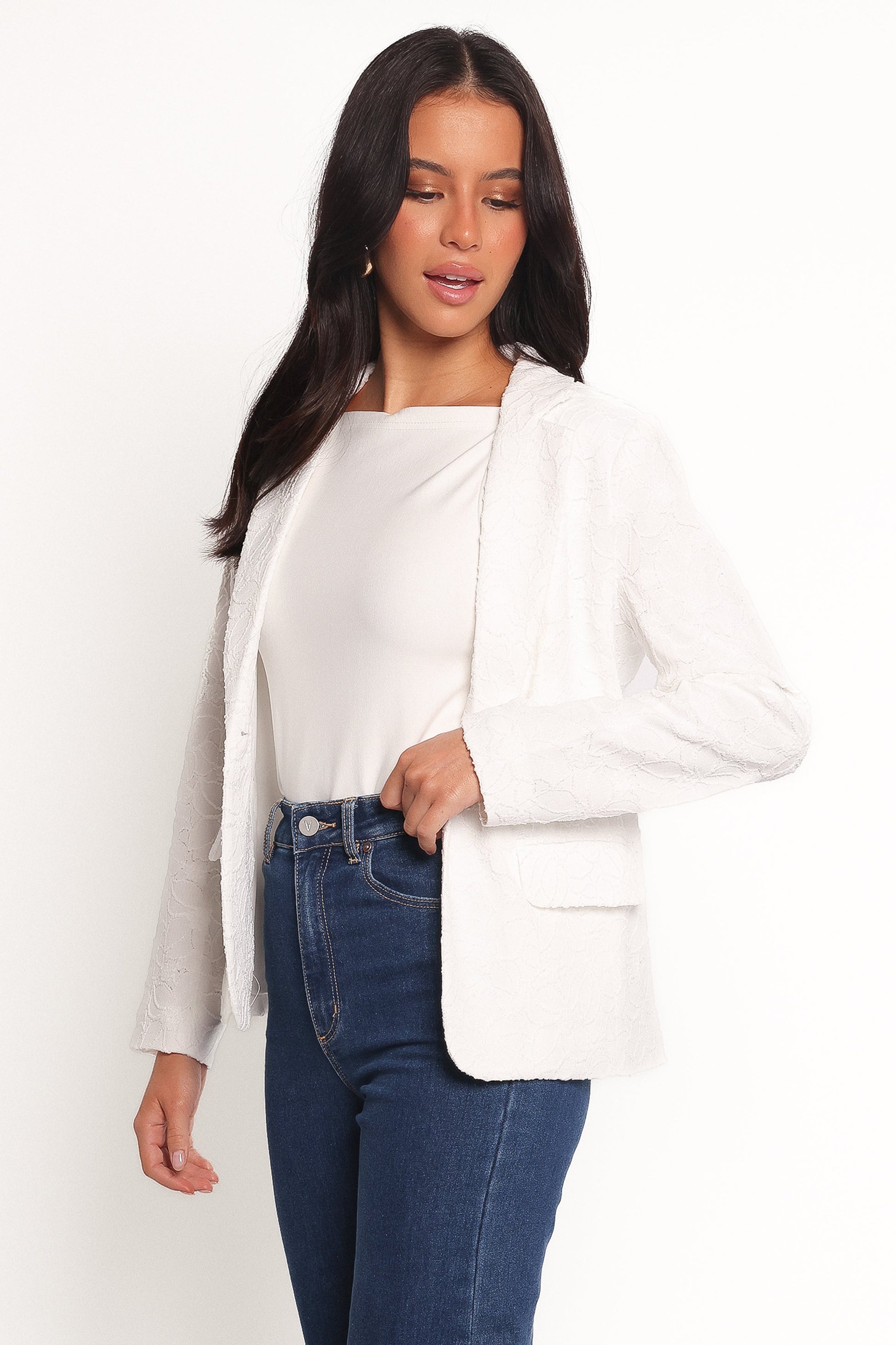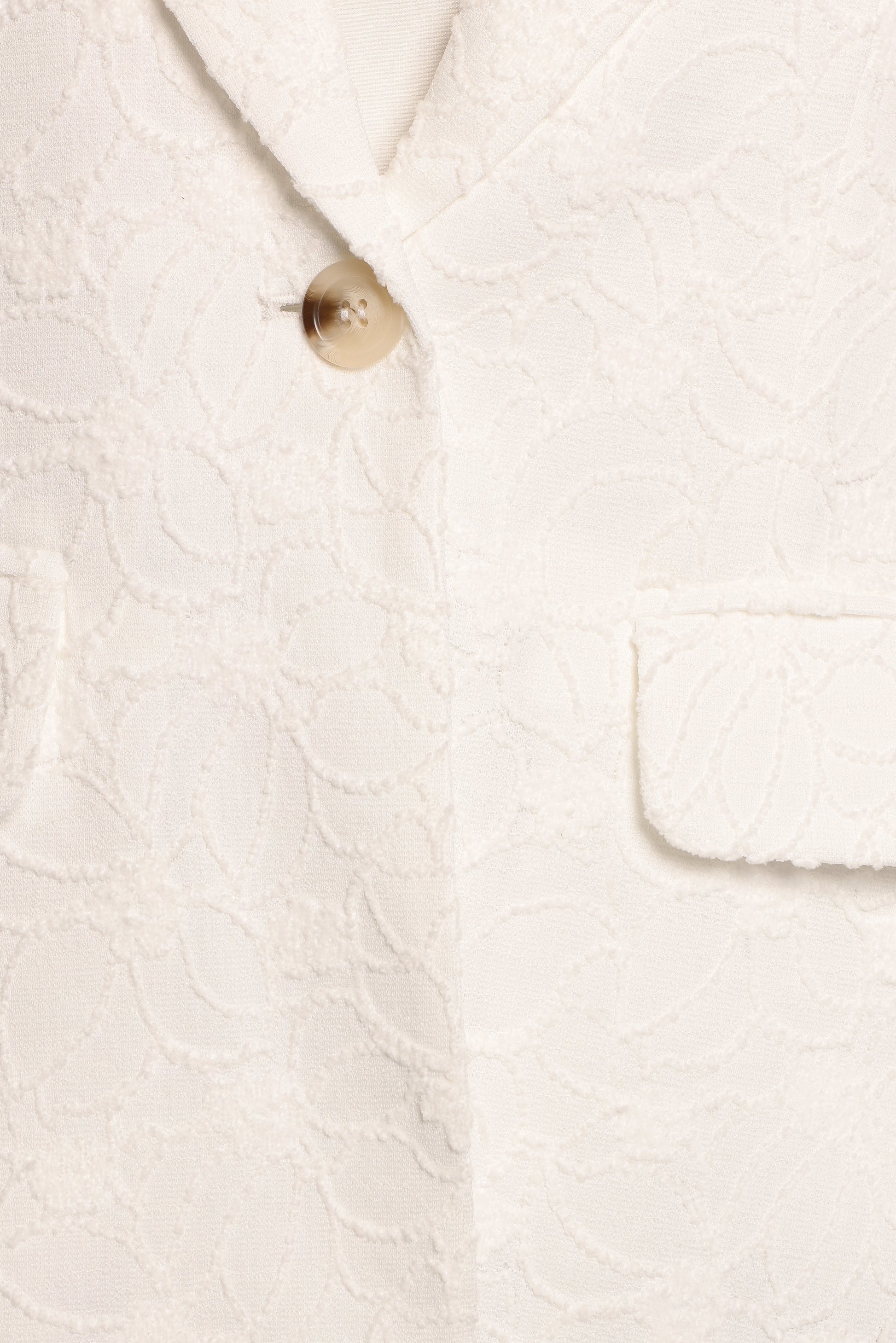 DETAILS Effortlessly chic and endlessly versatile, the Darian Lace Knit Single Button Blazer in Off White is your go-to piece for upgrading any outfit. Designed with a sleek notch lapel and a flattering v-neckline, this blazer brings a tailored edge to your look without sacrificing comfort.