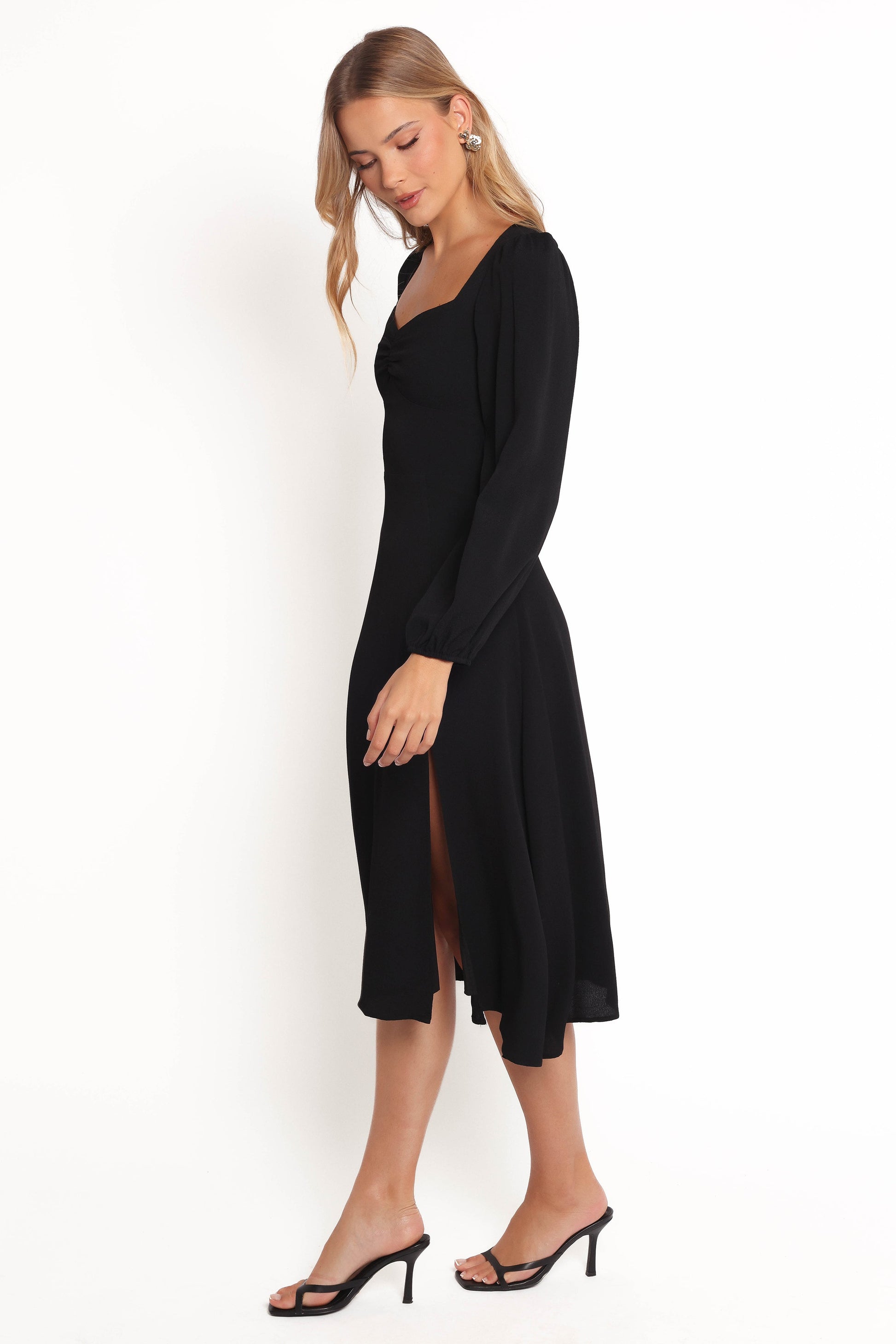 DETAILS Meet your new favorite dress for any occasion, the Franklin Long Sleeve Midi Dress in classic black. This elegant piece is designed to complement your every move, with a graceful midi length that pairs beautifully with heels or boots.
