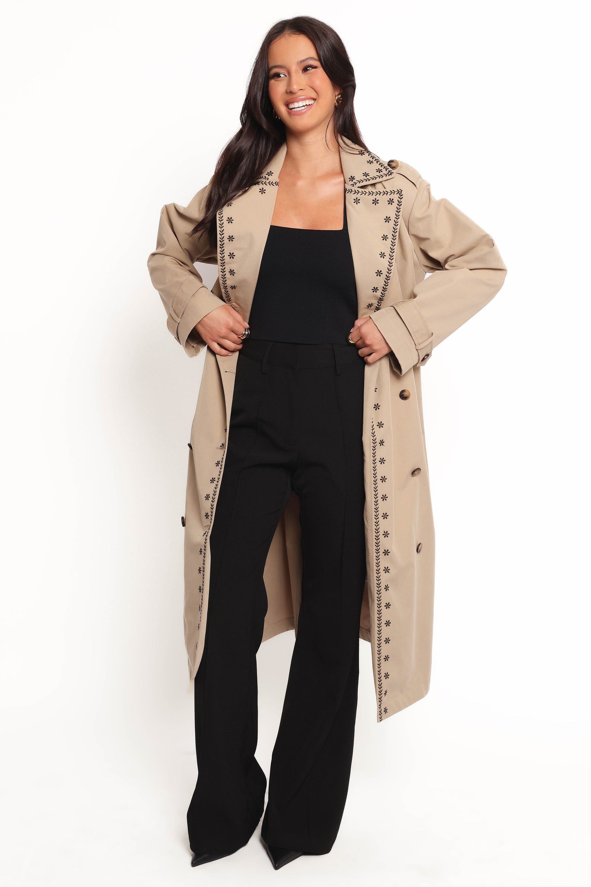 DETAILS This elegant coat features a classic notch lapel and long sleeves, lending a polished touch to any outfit. The double-breasted button closure ensures a snug fit, while the belt loops and detachable waist tie allow you to accentuate your silhouette effortlessly.