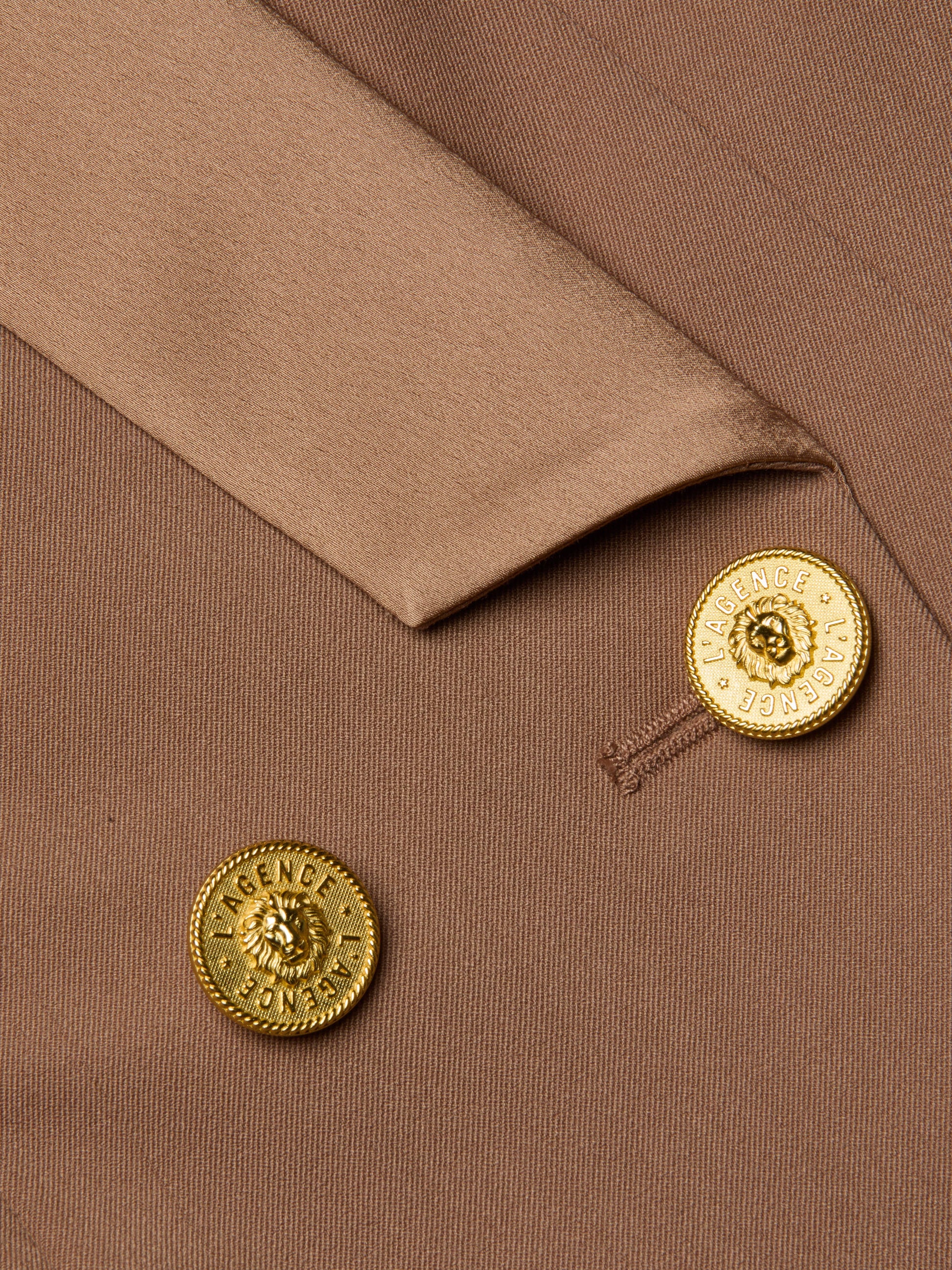 A sharp, timeless double-breasted blazer accented with a lustrous satin lapel. Now in a neutral tan.