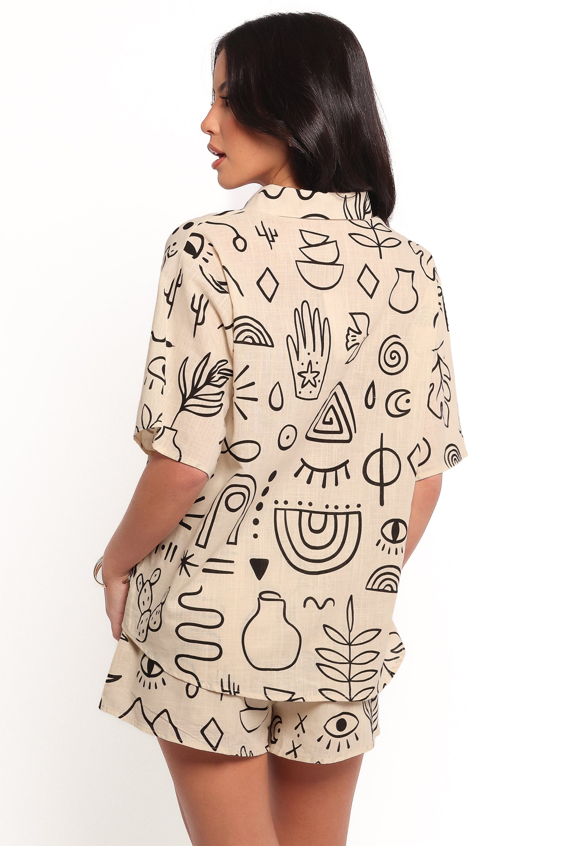 DETAILS Imagine yourself strolling through the city streets or lounging at a garden party, effortlessly chic in this coordinated ensemble. The set features a button-down shirt with a spread collar and v-neckline paired with high-waisted shorts that boast an elasticised waistband, ensuring a comfortable fit that moves with you.