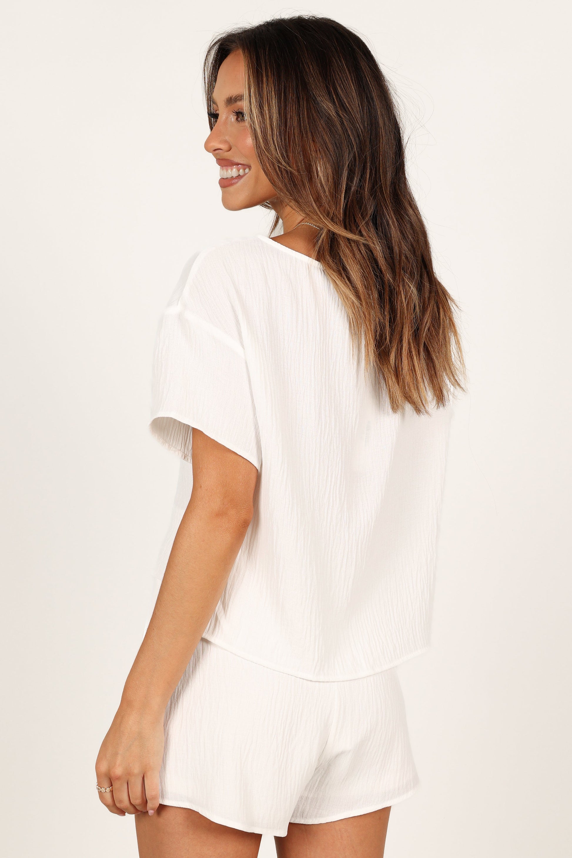 DETAILS This top and shorts set is sure to make you stand out! Perfect for a day of lounging in the sun, this two-piece features a round neckline, short sleeves and side splits. It has a relaxed fit for a casual, comfortable look.