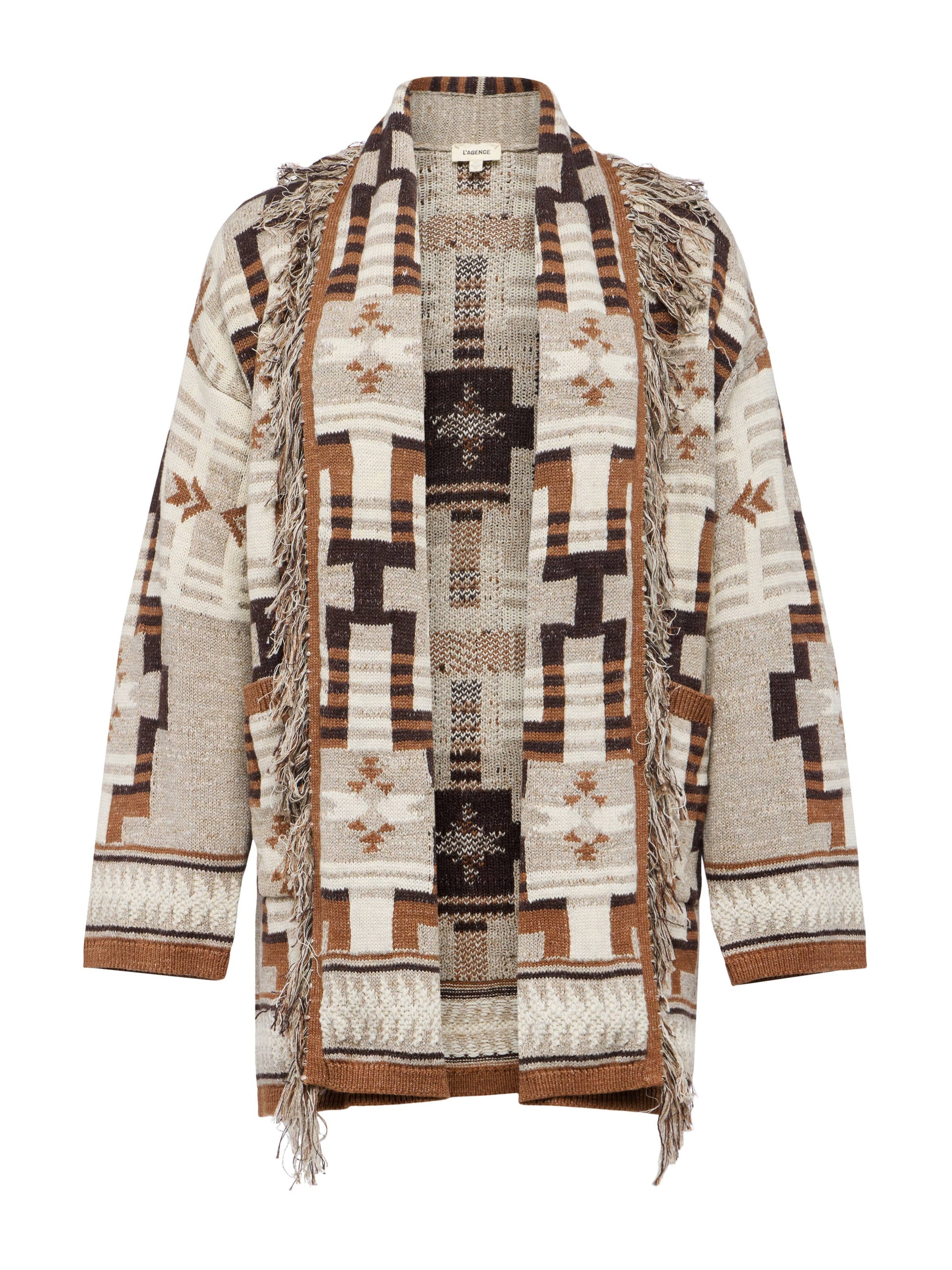 Cozy up in the Jair cardigan, featuring a bold geometric pattern in earthy tones. Detailed with textured stitching and fringe trim for a boho-chic finish that’s perfect for layering.