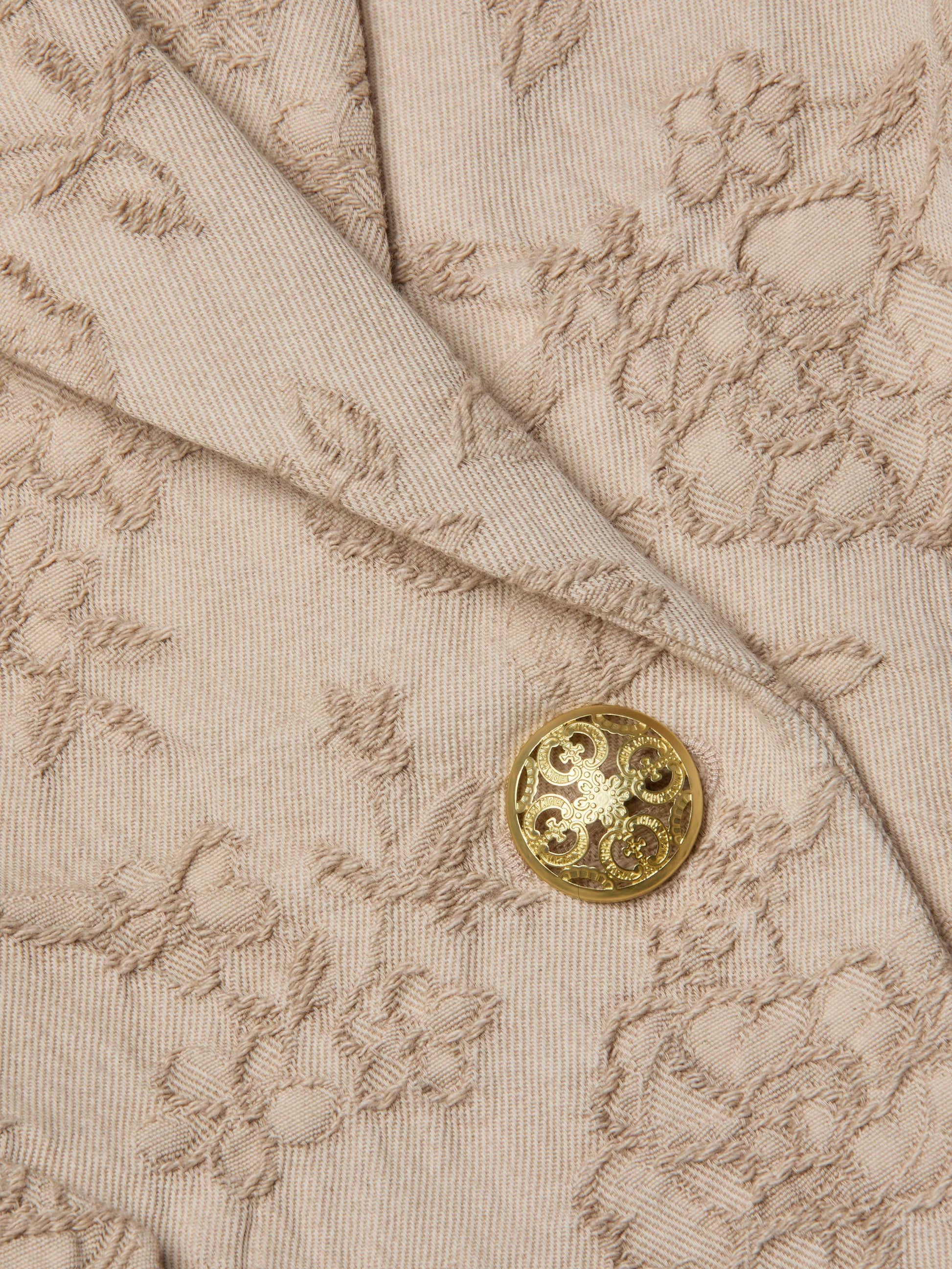 The Jennah is a tailored blazer in crinkled cotton twill, featuring a tonal floral jacquard and a softly sculpted silhouette. Folded side darts contour the waist for a flattering fit, while an ornate gold button adds the perfect finishing touch.