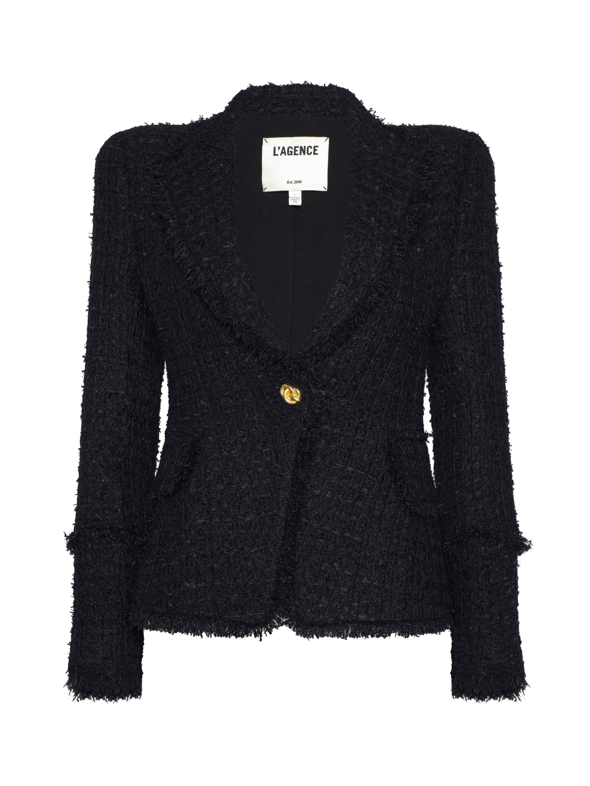 Timeless with a twist, the Kaisley is a tailored tweed blazer that blends classic sophistication with subtle edge. The textured fabric and frayed trims add dimension, while novelty buttons along the cuffs add just the right amount of intrigue. Fitted through the waist, it elevates denim or layers effortlessly over sleek dresses.