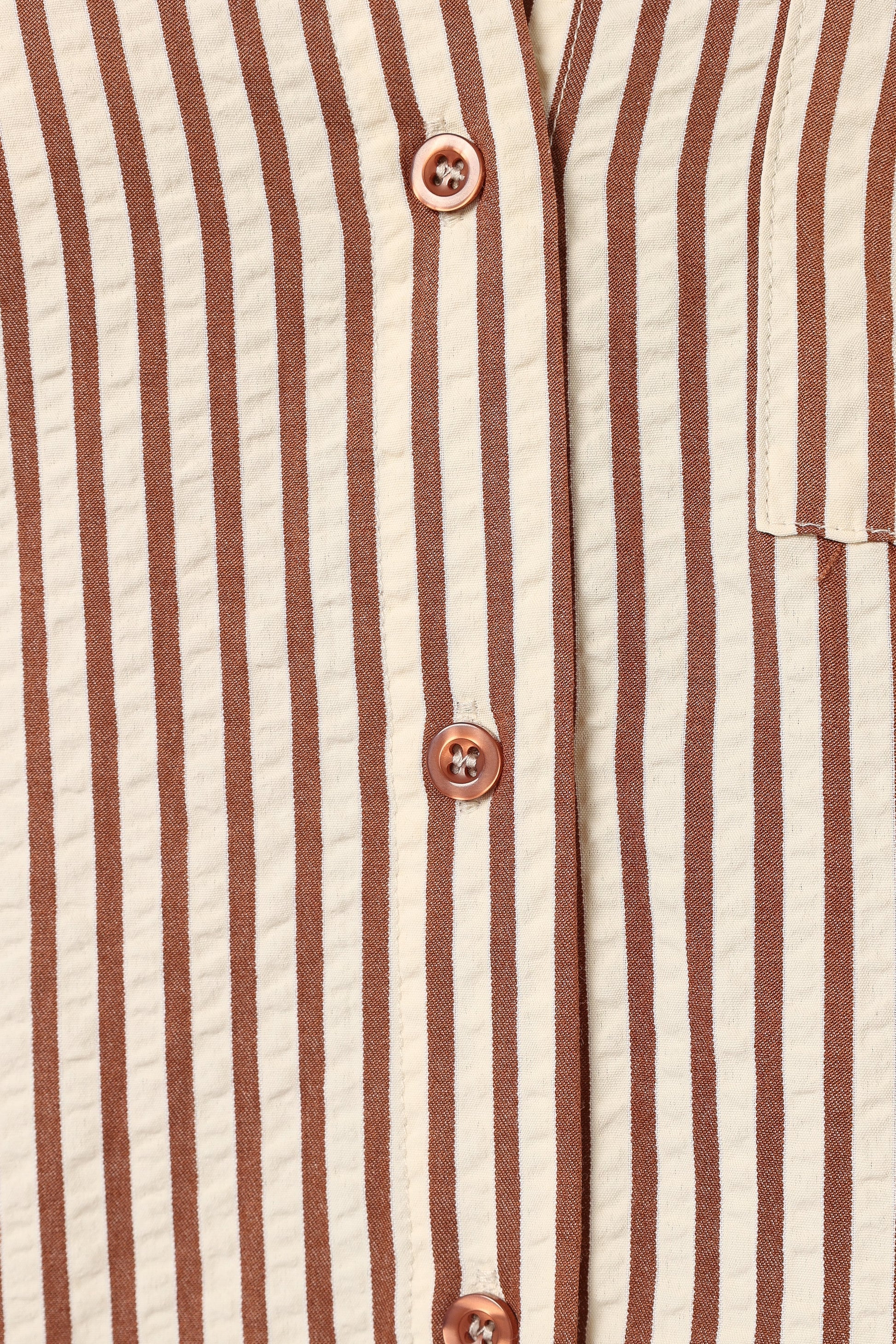 DETAILS Discover our Kennie Top in Brown Stripe, it's chic relaxed fit is crafted with long sleeves, functional buttons down front, and stylish stripe print are perfect for any season. Unlined for lightweight comfort.