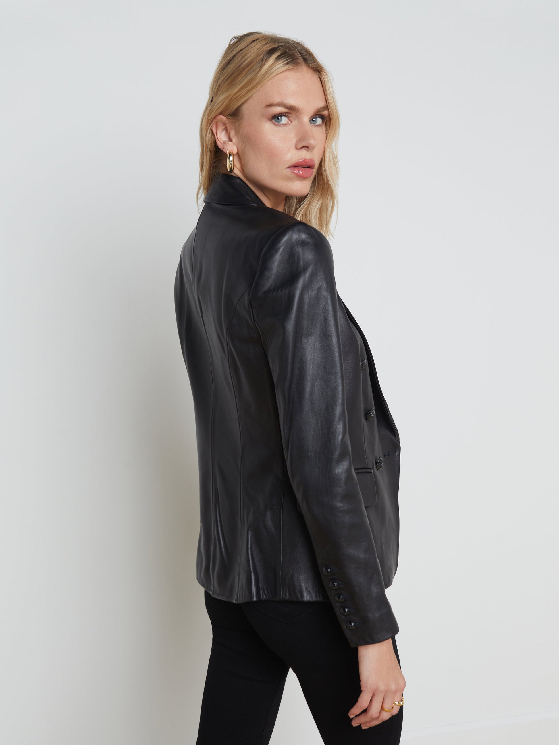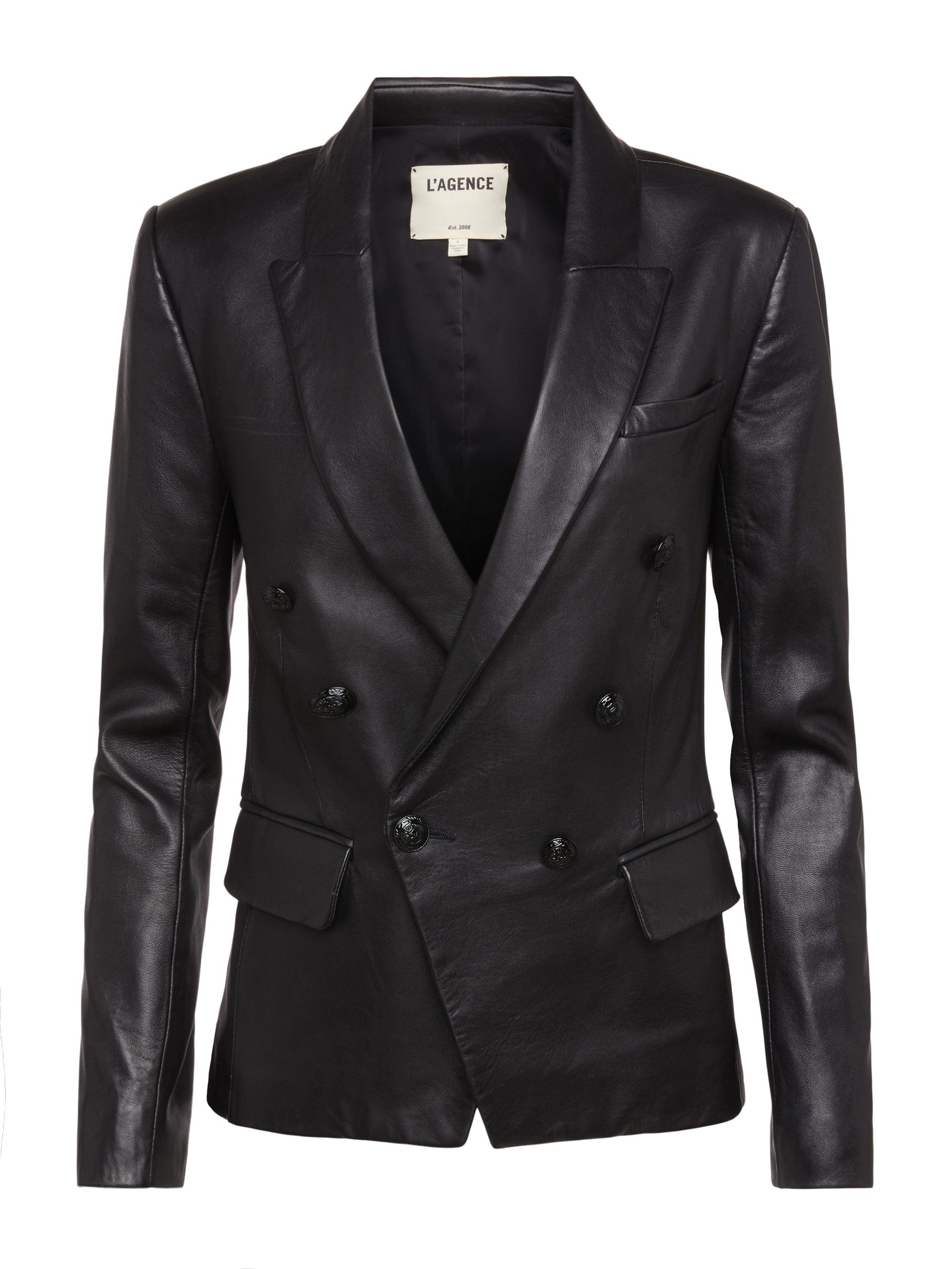 A classic double-breasted blazer elevated by luxury lambskin leather in black. Meticulous craftsmanship is evident in the expertly handled angled flap pockets and single welt pocket. Additional chic details include strong shoulders, peaked lapels, fitted waist and embossed dome buttons. Fully lined. 100% Lambskin.