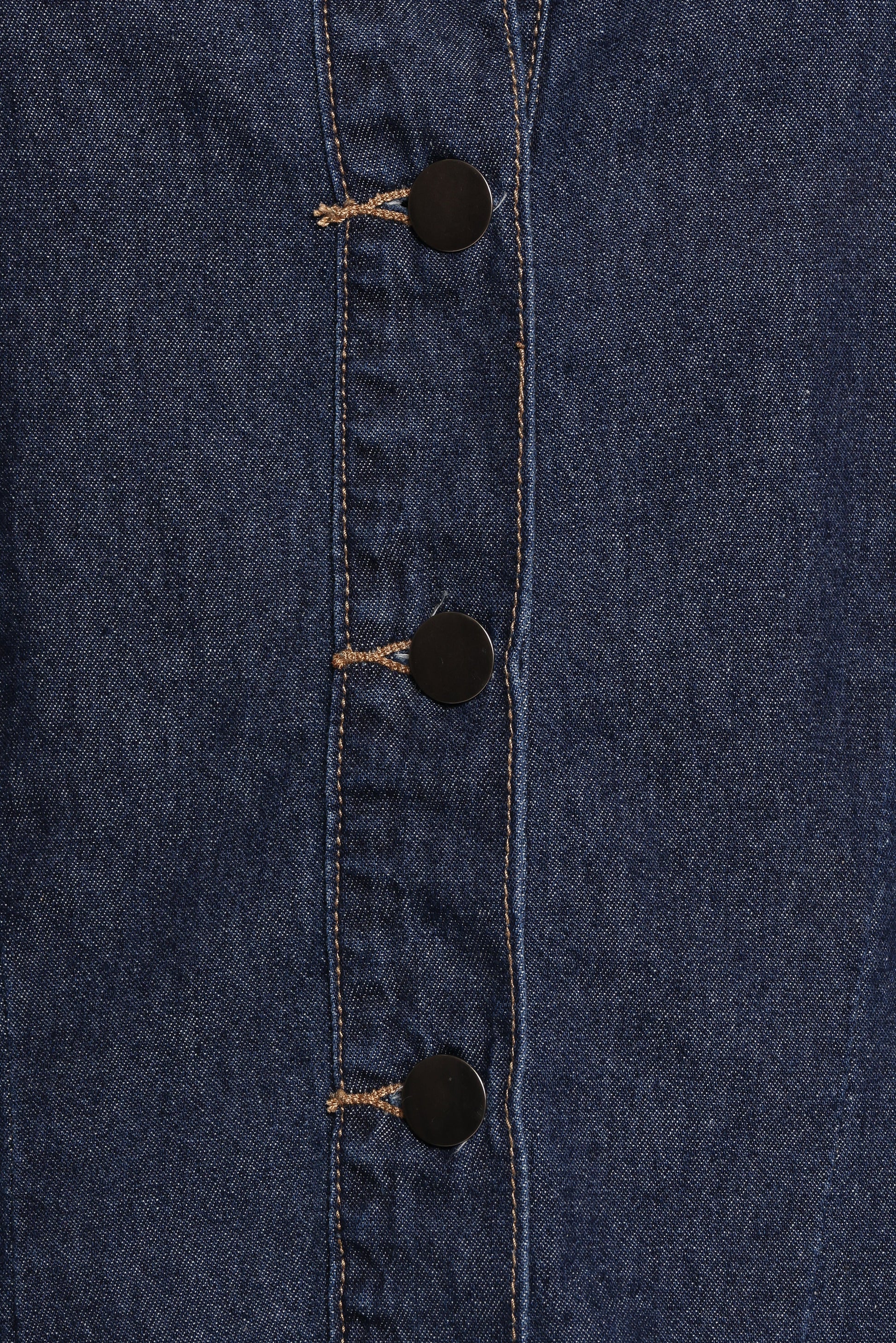 DETAILS The Kirie Denim Top in Indigo is your go-to staple for effortless style. Featuring a sleeveless, collared design with a functional button-down front, it pairs perfectly with everything from high-waisted skirts to tailored pants. The contrast stitching and mid-wash denim offer a trendy edge to elevate any outfit.