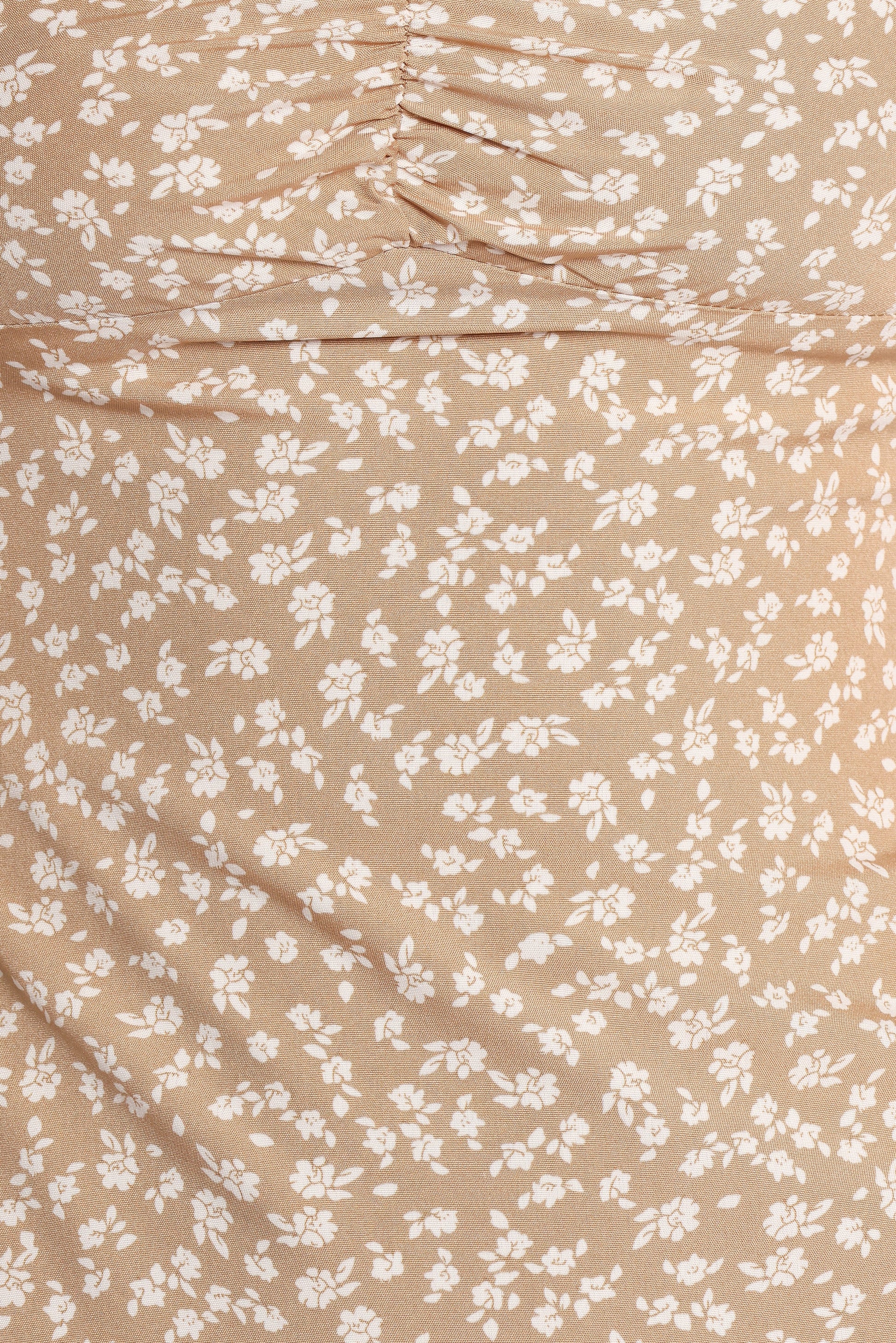 DETAILS Its flowing maxi length creates an effortlessly chic silhouette perfect for any occasion, while the short sleeves with elasticized cuffs add a delicate, comfortable touch. The sweetheart neckline and ruched bust detailing bring a sense of timeless romance to your look, complemented by a subtle floral print that adds a softening of hint of femininity.