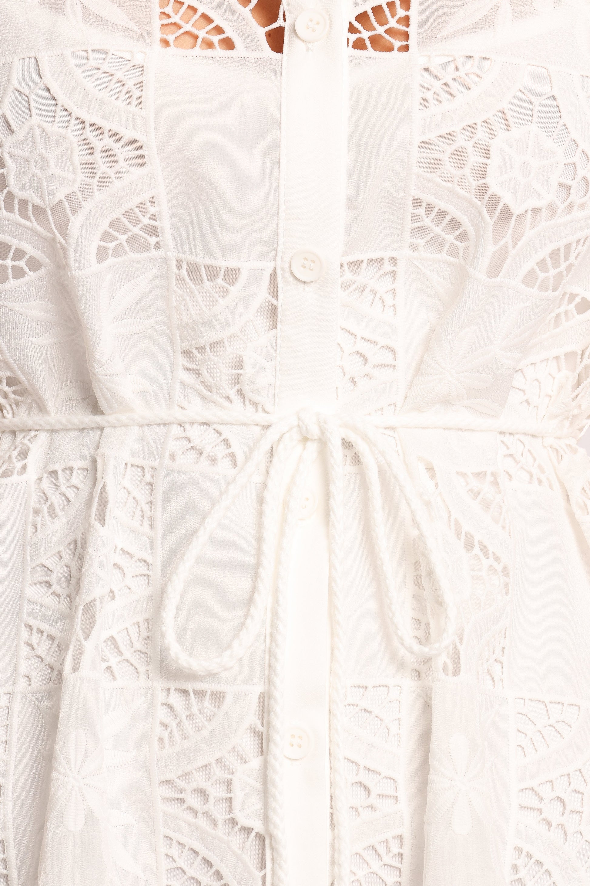 DETAILS Featuring a polished collared neckline and functional button-down front, this mini-length dress strikes the perfect balance between casual and elevated. Short sleeves and an intricate embroidered design add a touch of detail that sets this piece apart.