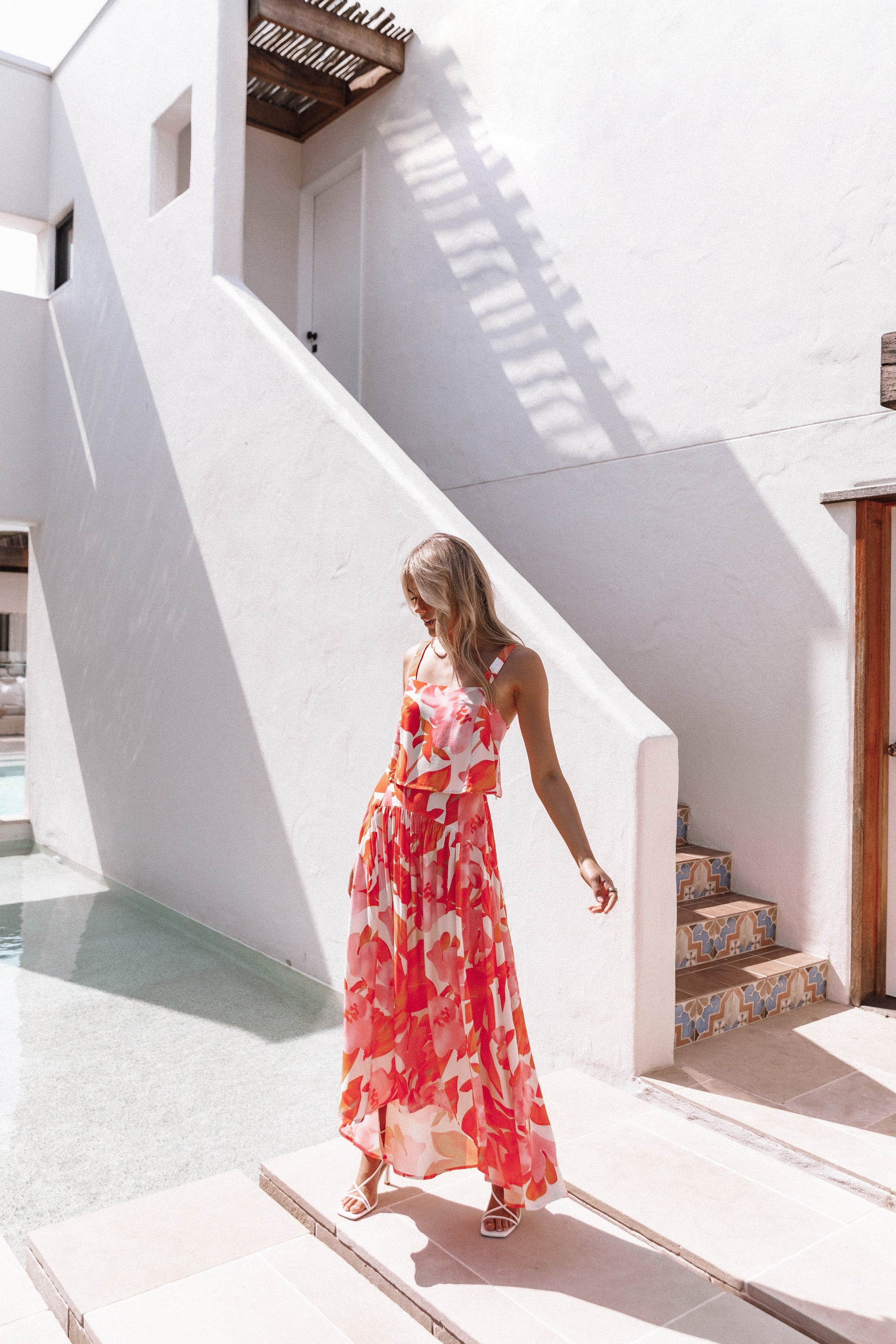 DETAILS Feel your most confident in this stylish crop and skirt set. Featuring a cropped length top with non adjustable straps, straight neckline, and side invisible zip for an easy fit. Complete the look with a high-low skirt featuring an elasticised waistband at back, side invisible zip, and oh-so stunning pink floral print.