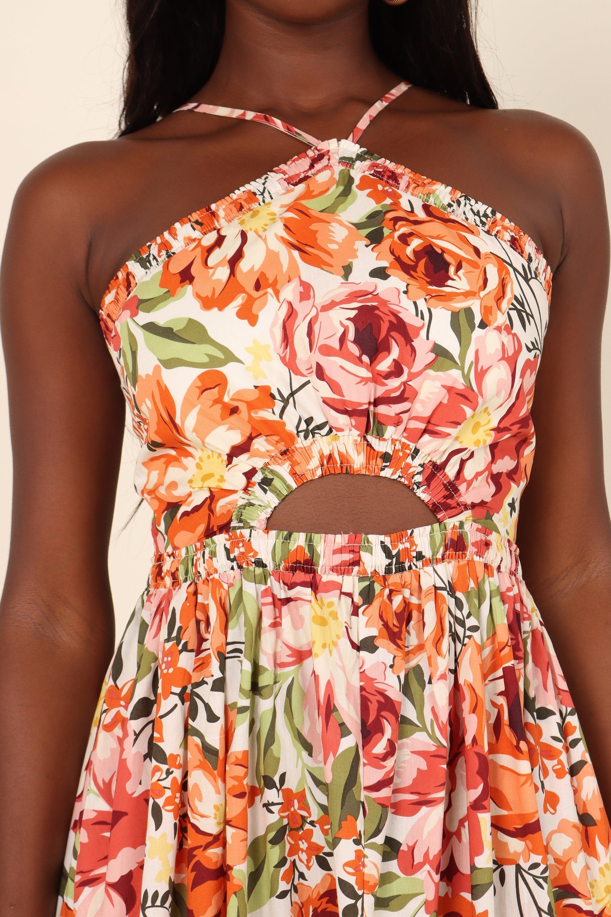 DETAILS Meet our playful yet trendy Madeira Dress! With its captivating orange floral print, flirty halterneck, and cute cut-out detail under the bust, you're in for a trendy twist. Its shirred elasticised waistband and handy pockets add a dash of practicality to this fashion-forward piece.