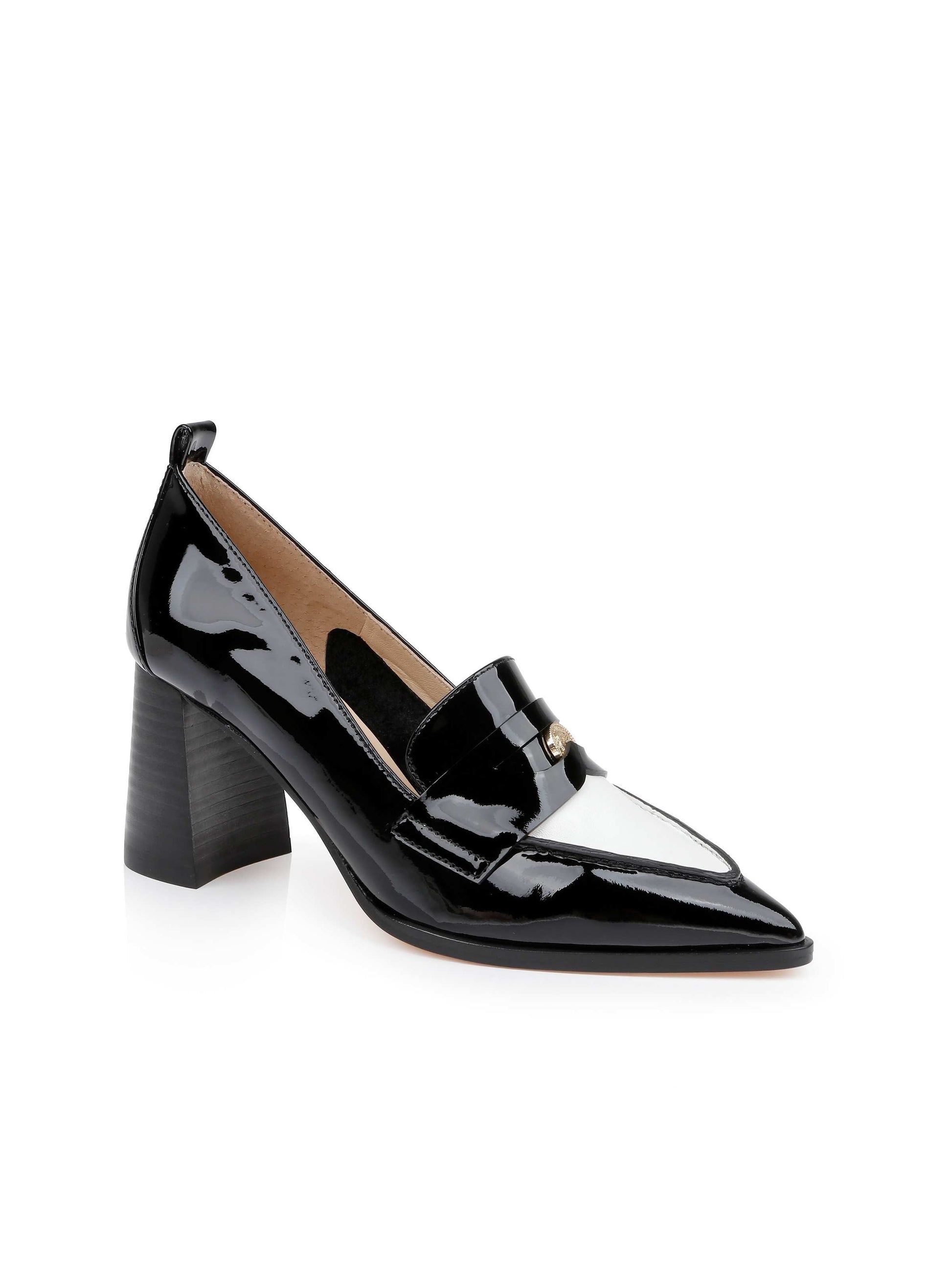 Crafted in glossy patent leather, the Mallory is a two-tone loafer pump, featuring a sharp pointed toe, contrast vamp, and stacked block heel. It's the perfect blend of classic tailored style with modern edge.