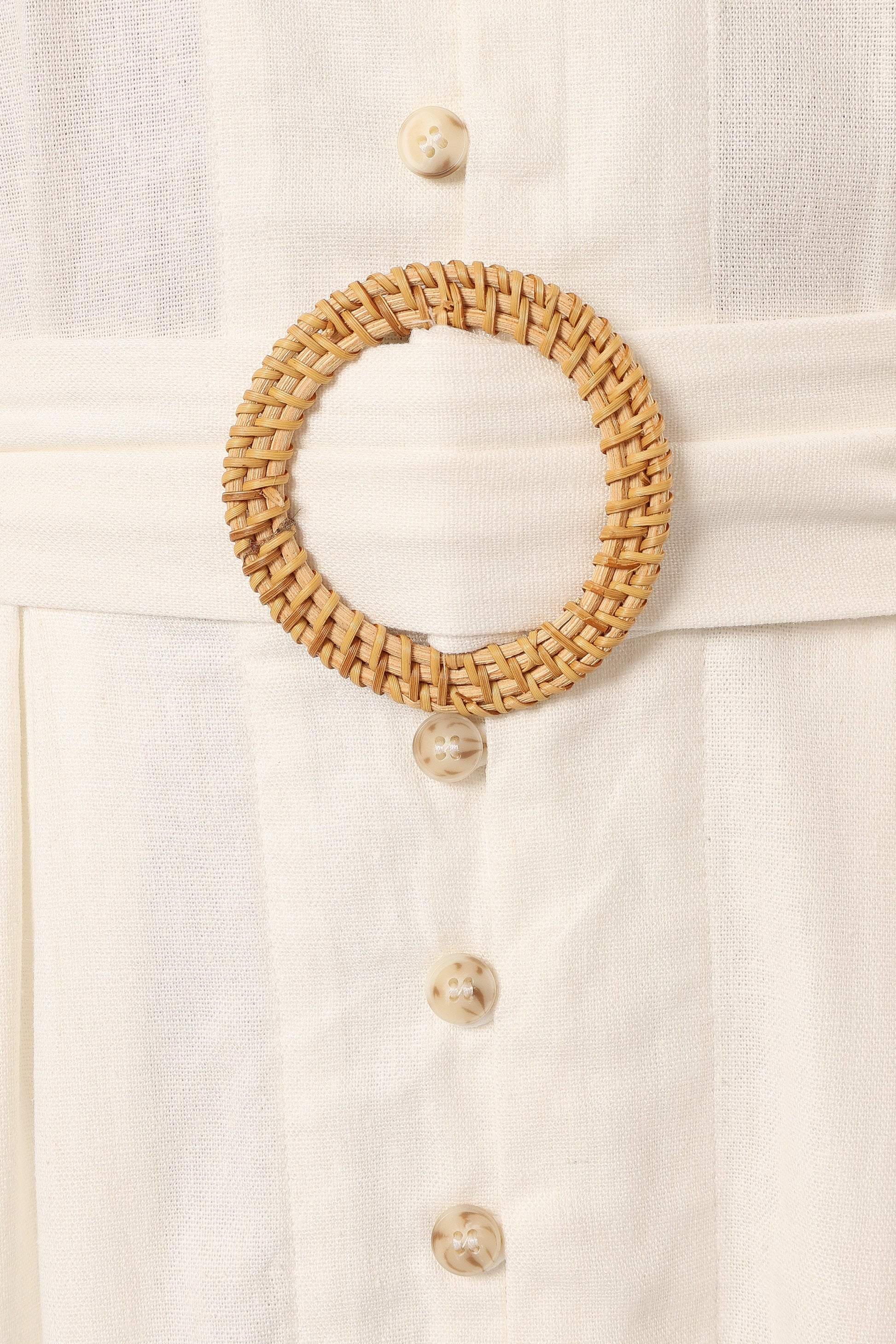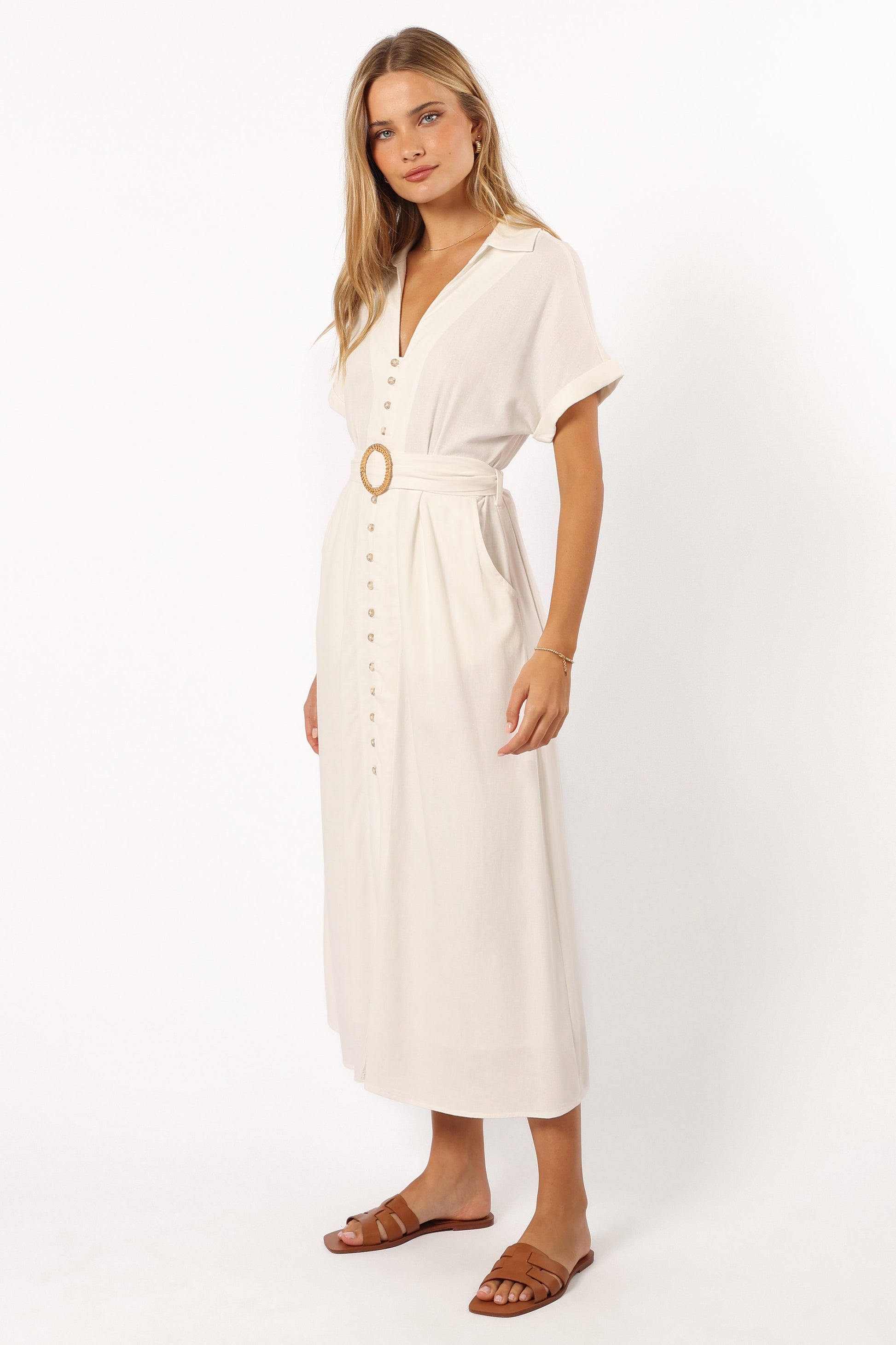 DETAILS Introducing our Orla Short Sleeve Midi Dress in ivory. The v neckline with collar adds a graceful silhouette, with the detachable belt and elasticised waist at back ensures the perfect fit.