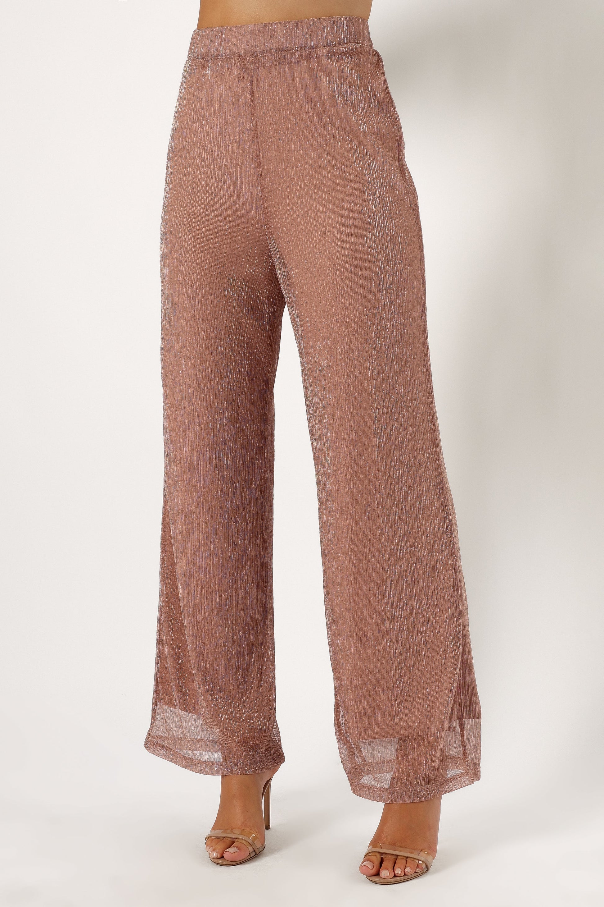 DETAILS Party season is here and it's time to get dressed up! These high waisted pants with elasticised waistband ensures that they fit like a glove while the plissé material and satin sheen finish adds a glamorous touch.