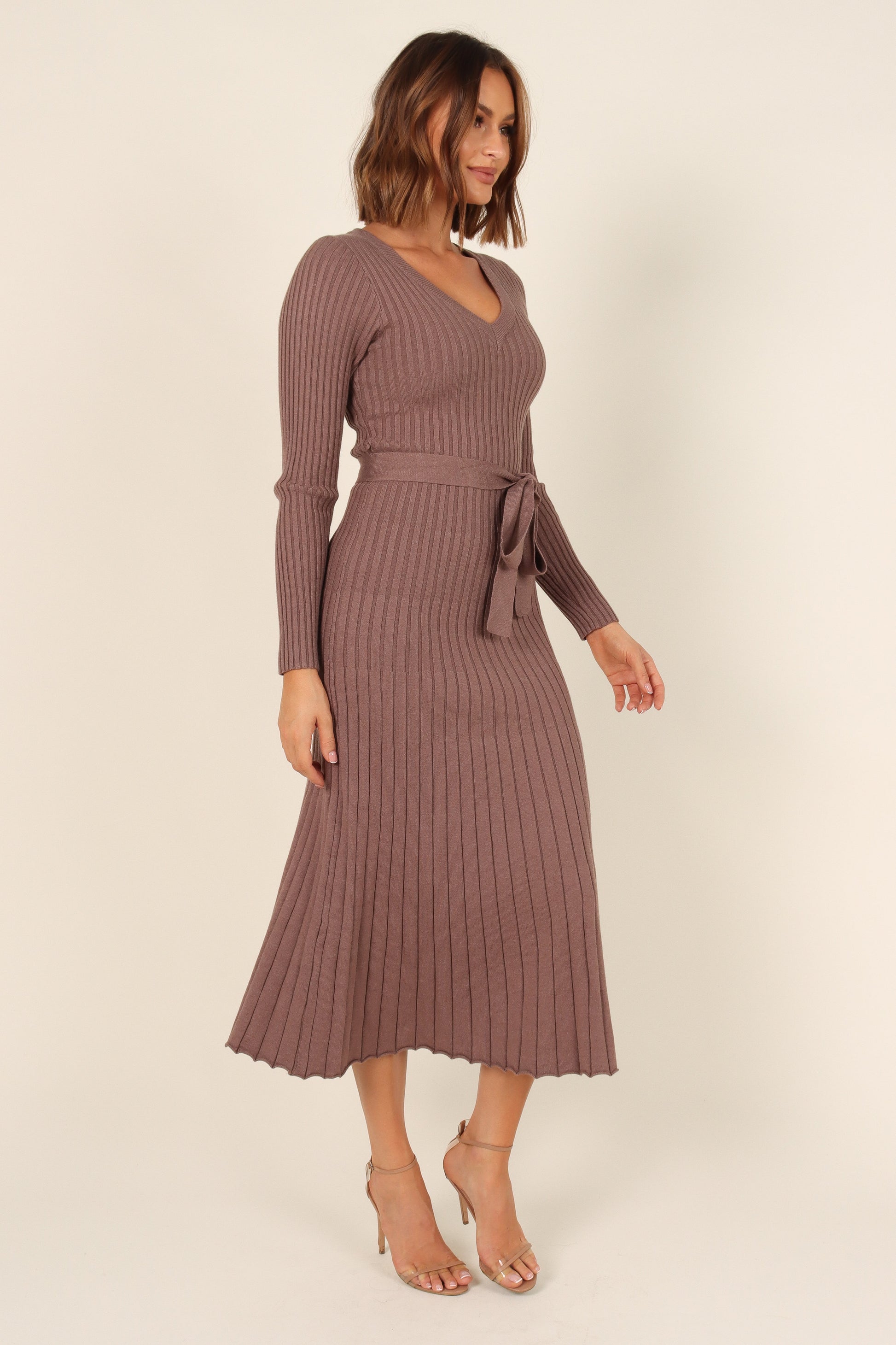 DETAILS Look sophisticated and feel fabulous in this midi length knit dress. The v-neckline and long sleeves give it a classic look, while the detachable waist tie with belt loops adds an extra touch of elegance. Crafted from stretch ribbed knit, this dress features a flared A-line skirt design for a flattering fit.