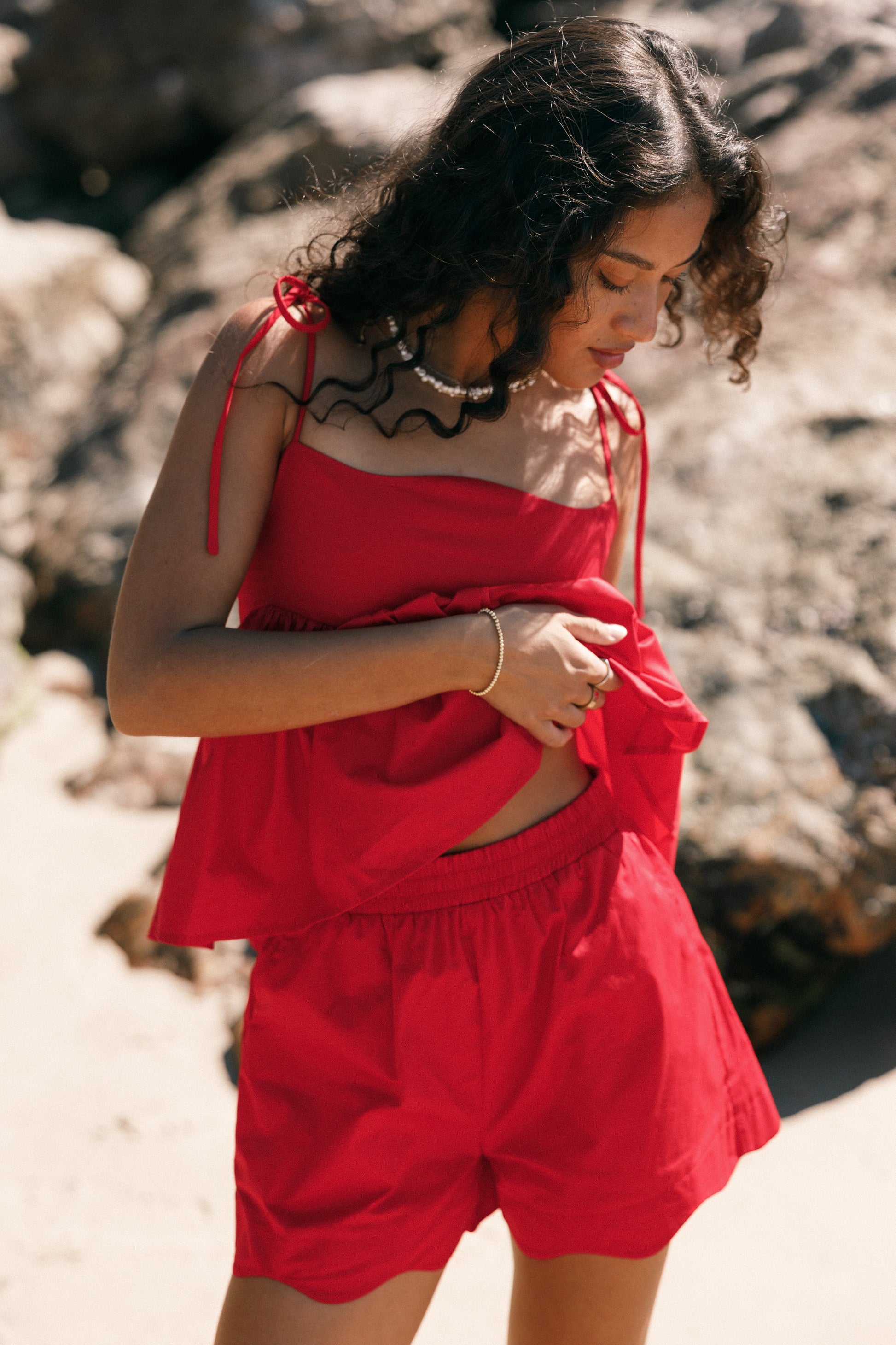 DETAILS Meet our Ricci Shorts in vibrant Red! These high-waisted statement pieces are designed with functionality and style in mind. Featuring a comfortable elasticised waistband and practical pockets, they're as versatile as they are fashionable.