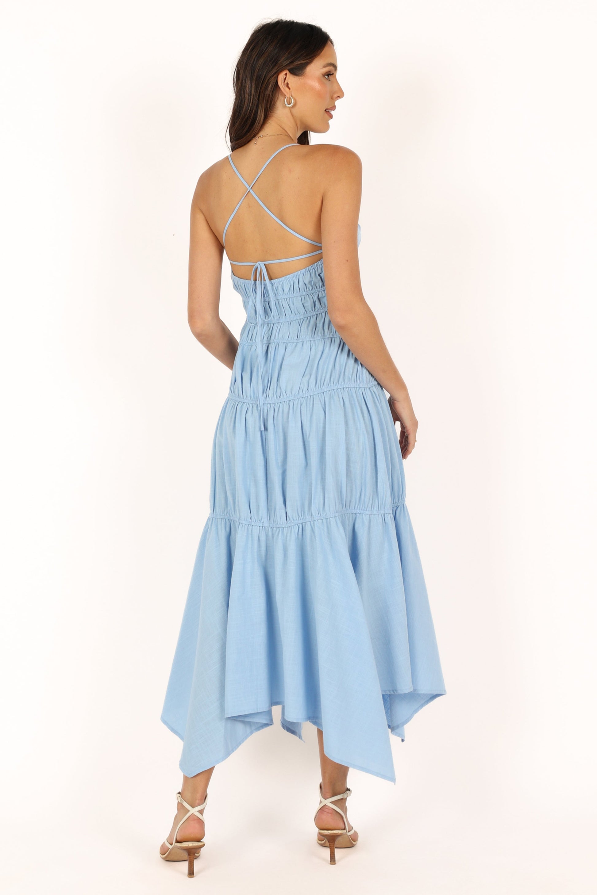 DETAILS This dress is a real statement piece! You'll turn heads in the room with its eye-catching v neckline, front cutout feature and thin straps. The back cross and tie closure are practical but stylish touches, further enhanced by the elastic detailing. Wear it for a special occasion or simply pair it with your favourite sandals for a flirty summer look.