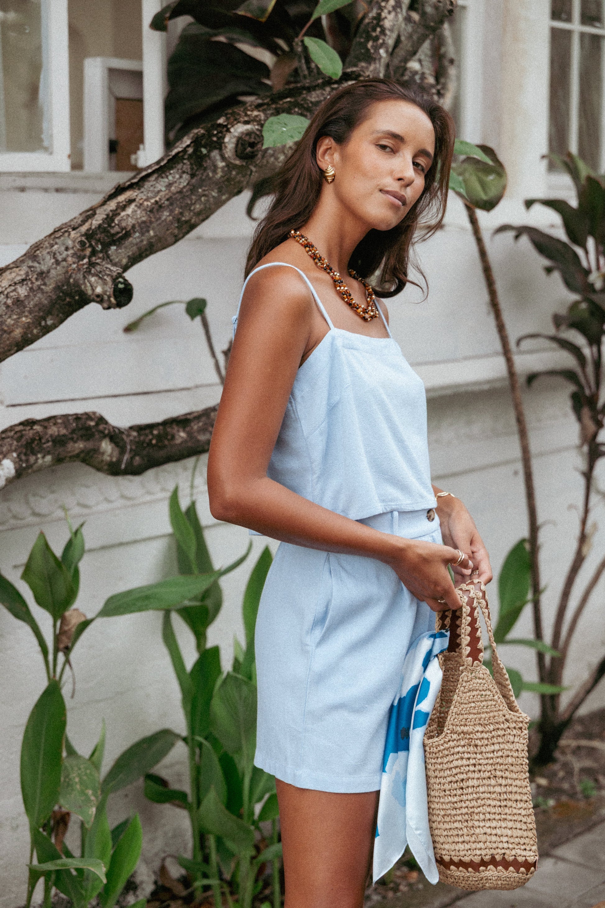 DETAILS This playful and fashion-forward shorts set is perfect for any occasion. Featuring a cropped length top with a square neckline, thin adjustable straps. High rise shorts with a front fly close with button, will have you styling on the streets!