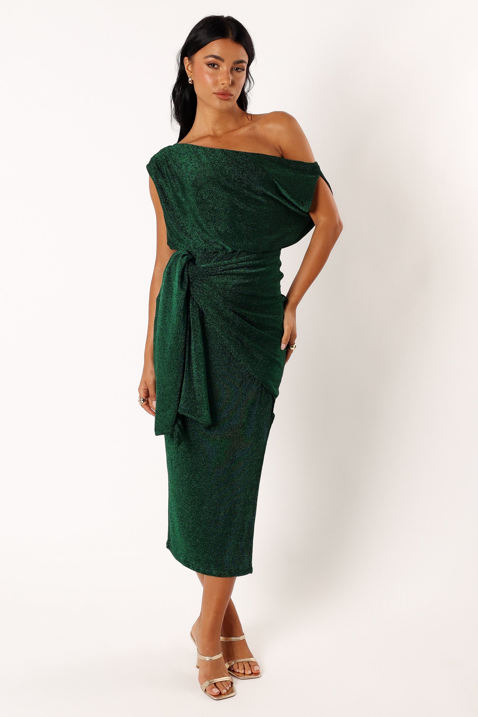 DETAILS This season, it's all about the perfect midi dress! Look no further than this gorgeous off shoulder style in a sleek emerald glitter material. With an asymmetric neckline, sleeveless design and attached waist tie, you'll be able to flaunt your figure and look sharp all summer long.