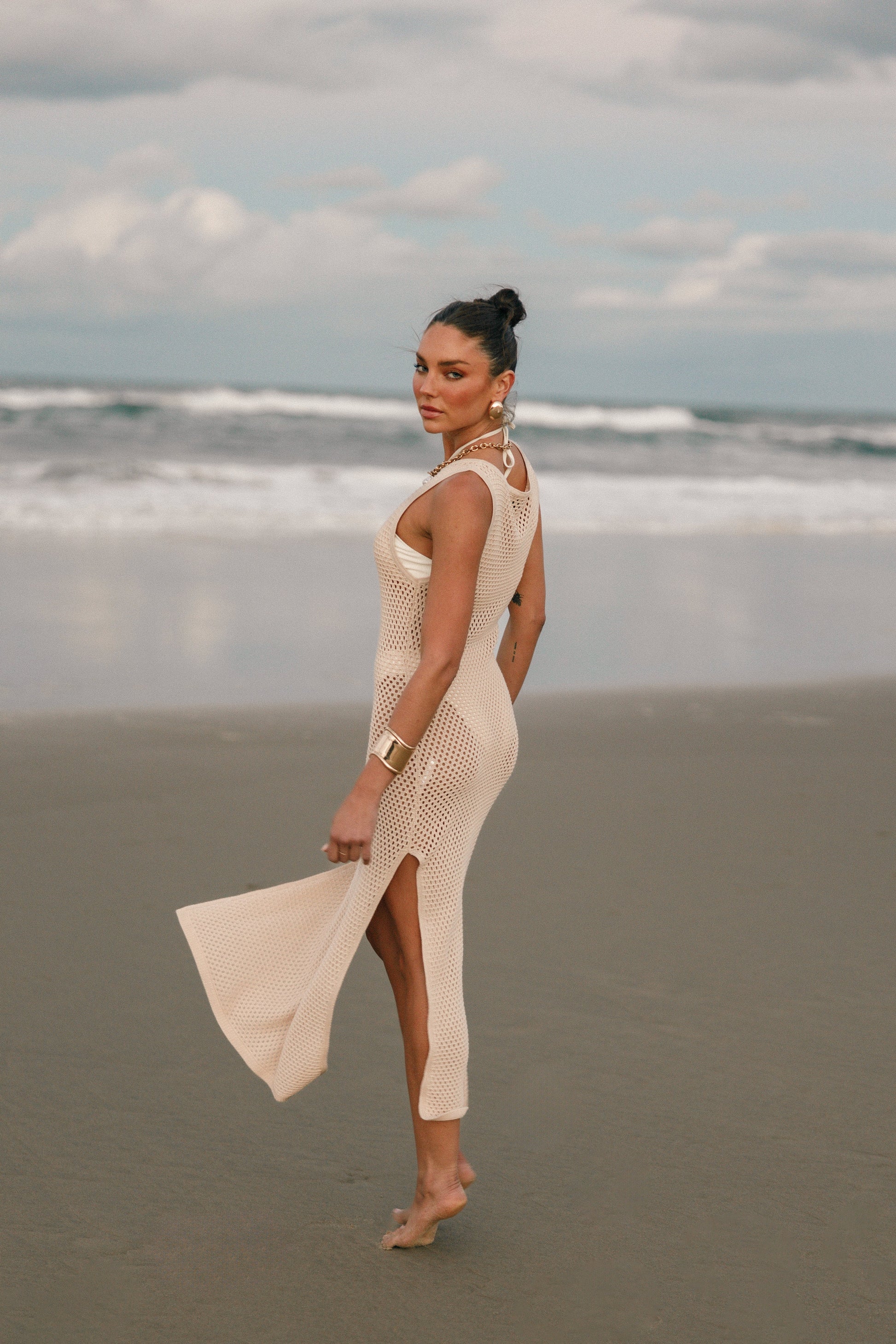 DETAILS Introducing the perfect addition to your summer wardrobe: our gorgeous Shamine midi dress. This dress features a boat neckline that exudes elegance, while the crochet knit adds a touch of fun.