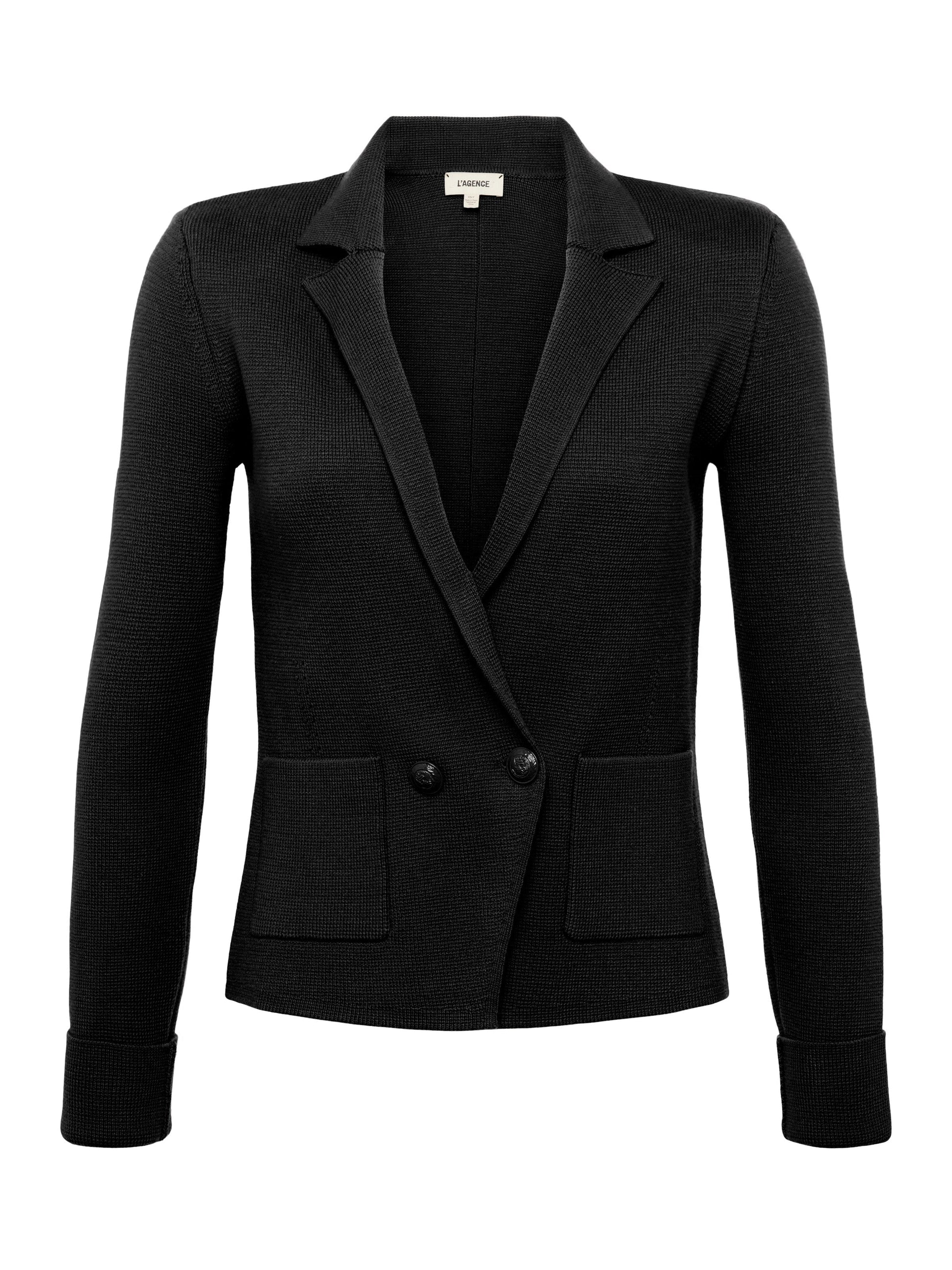 A double-breasted blazer in black premium knit. Tapered at the waist, supple, feminine style is balanced by smart tailored touches like strong shoulders, sleek lapels and patch pockets. Embossed-dome buttons add a luxe finish.