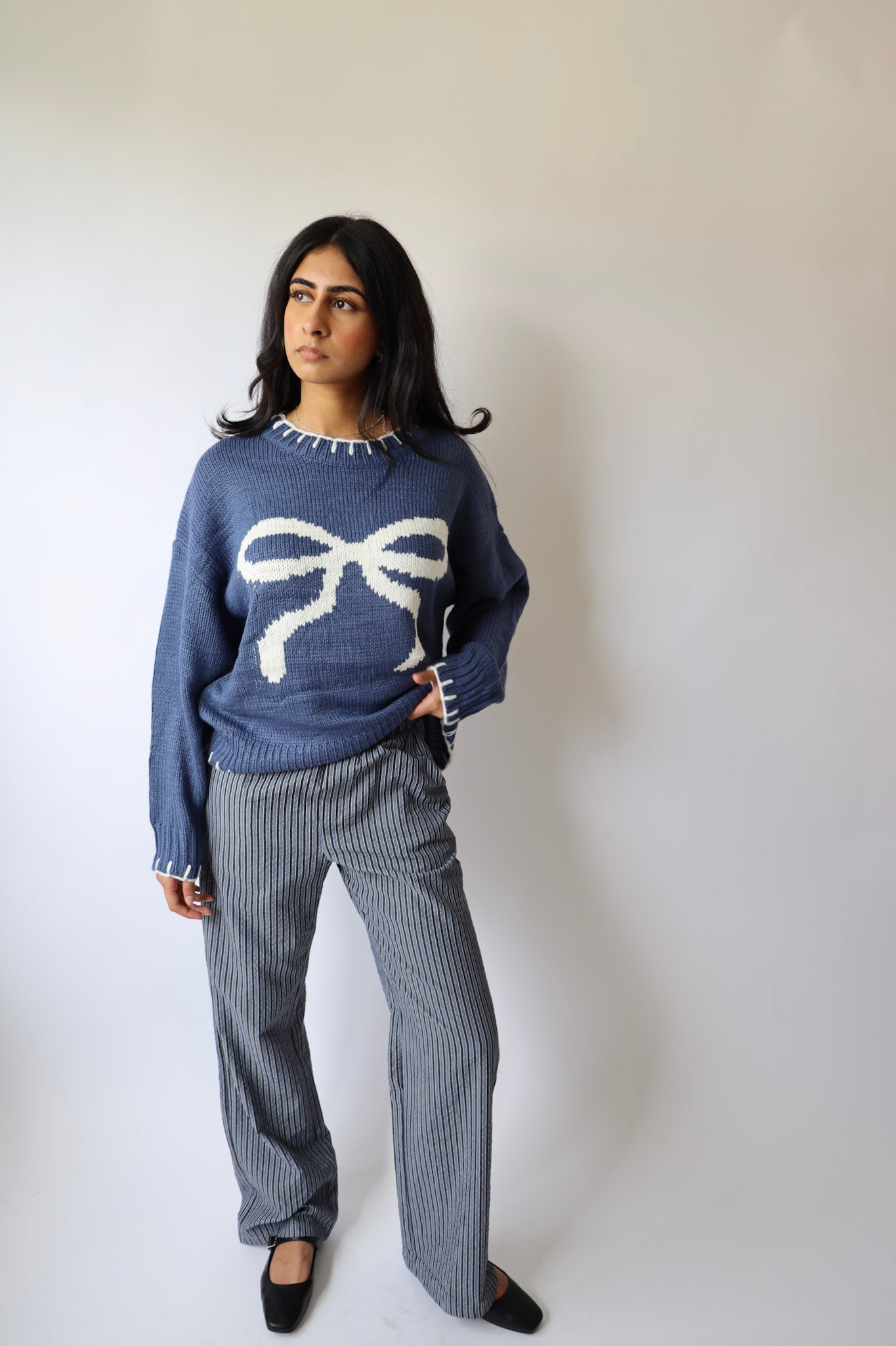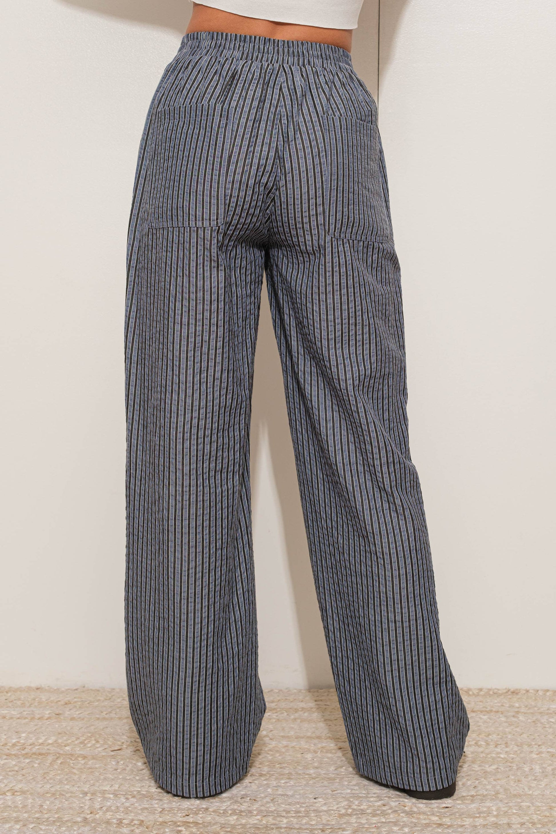 Get cozy and fall ready in these striped boxer and PJs inspired pants made of textured fabric. With a baggy, wide leg fit and high rise waist, you'll have plenty of room to lounge around or pair with a cute basic for busy end of summer days!