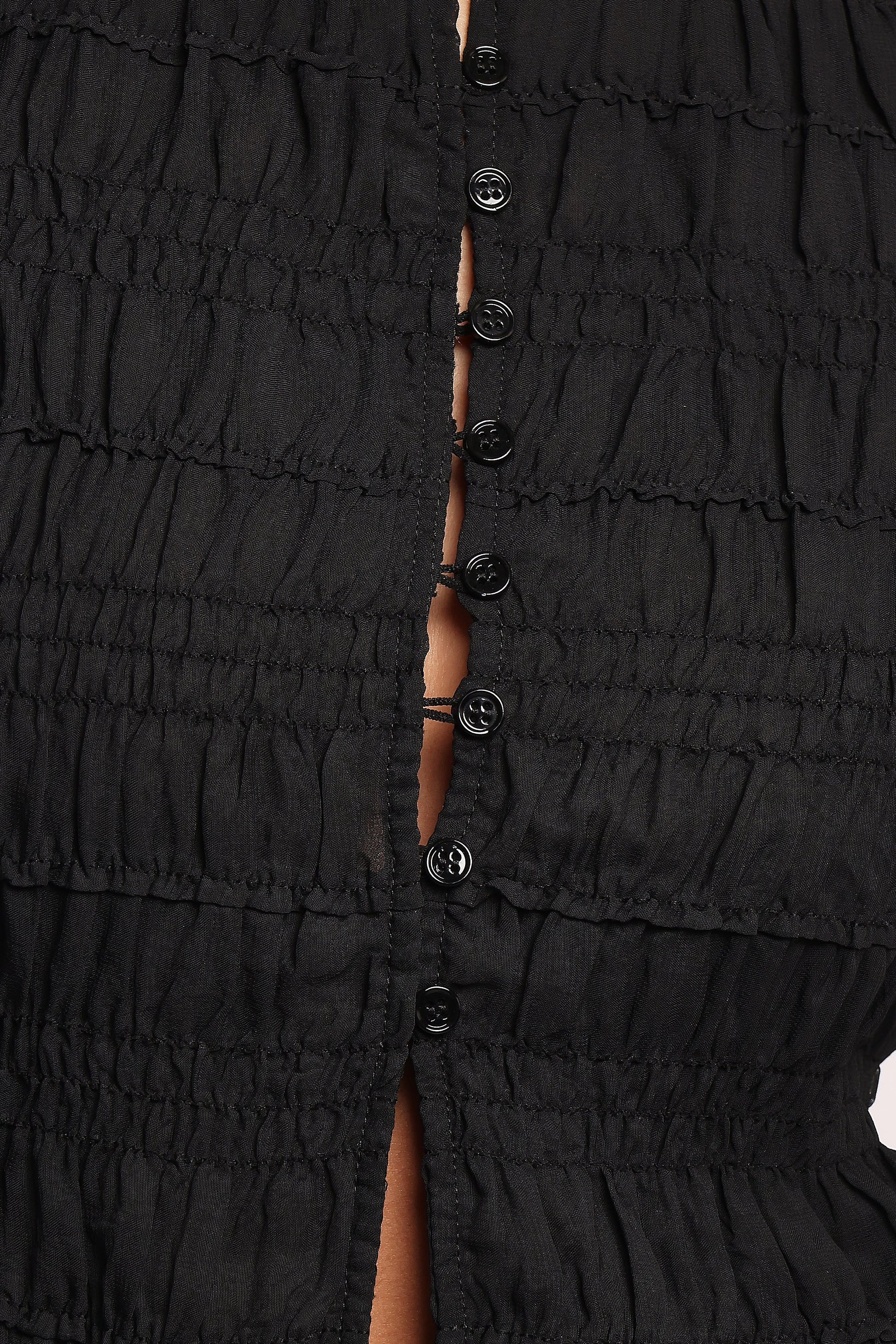 DETAILS Effortlessly chic and versatile, the Valana Top in Black is the ultimate wardrobe staple for every season. Designed with a classic round neckline and delicate short sleeves featuring a playful frill hemline, it strikes the perfect balance between modern sophistication and relaxed styling.