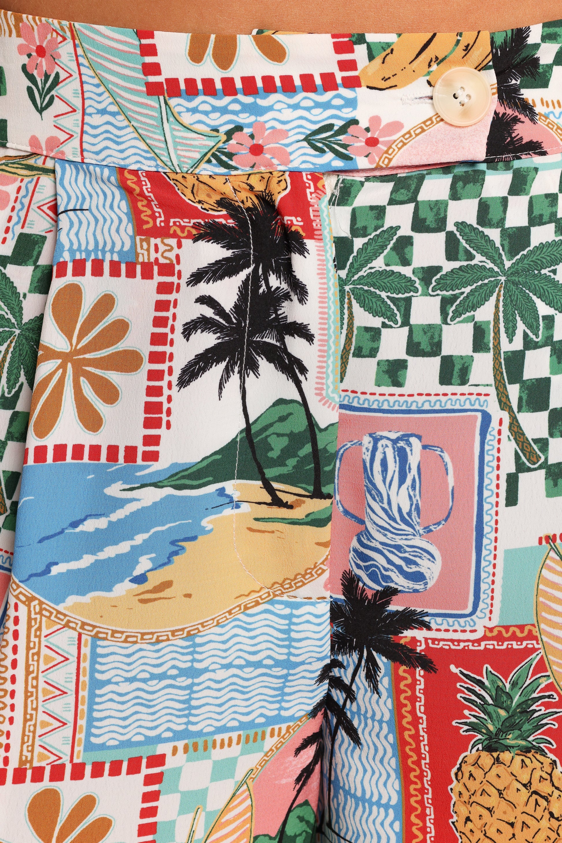 DETAILS Step into effortless summer vibes with the Valeria Pants in Off White Multi. These high-waisted trousers combine comfort and style with a back elasticised waistband and a sleek front zip-and-button closure.