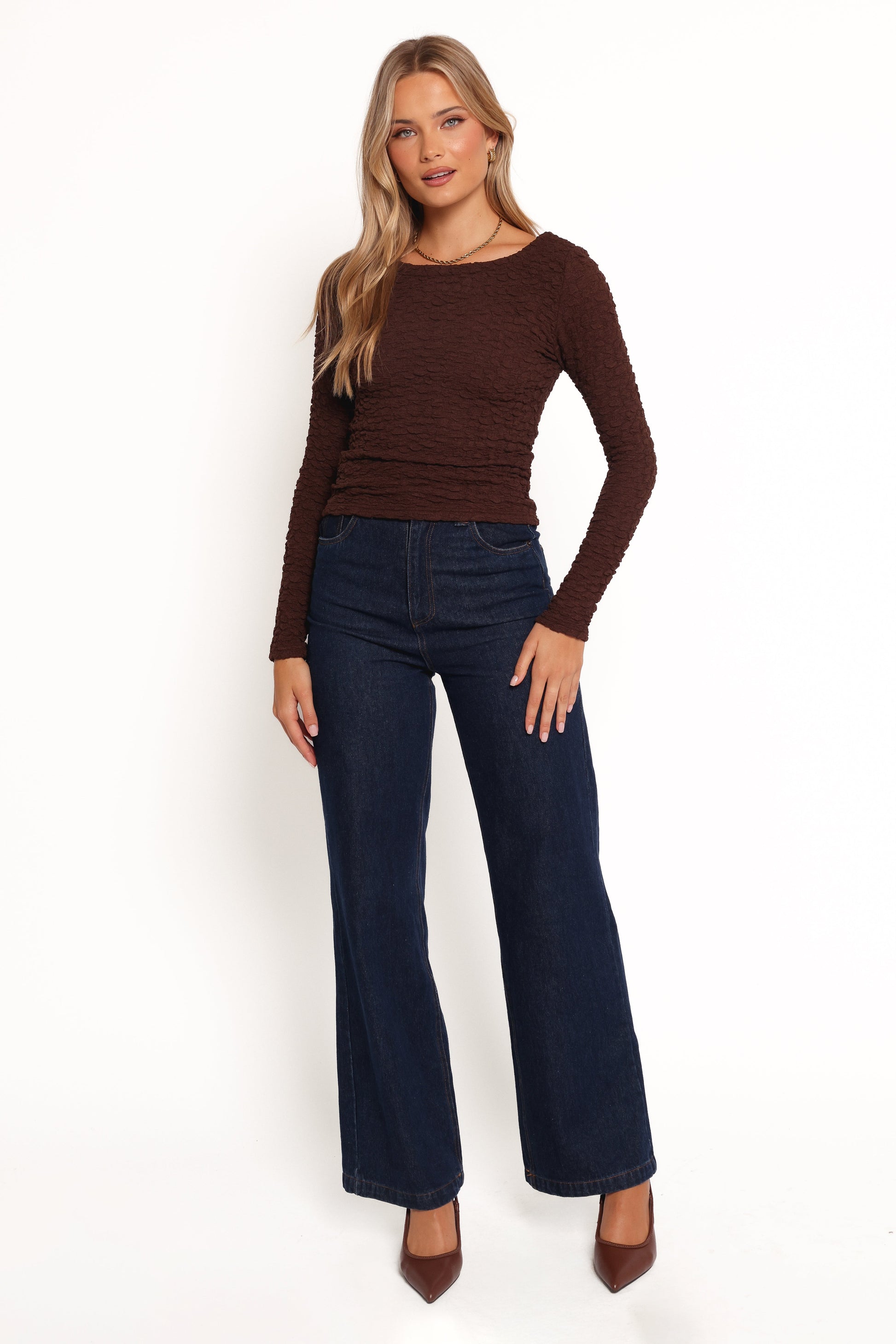 DETAILS Meet your wardrobe's new MVP, the Warren Long Sleeve Top in Brown. Effortlessly blending comfort and style, this top boasts a chic round neckline and a daring low cut scoop back design that adds an unexpected twist to your ensemble.