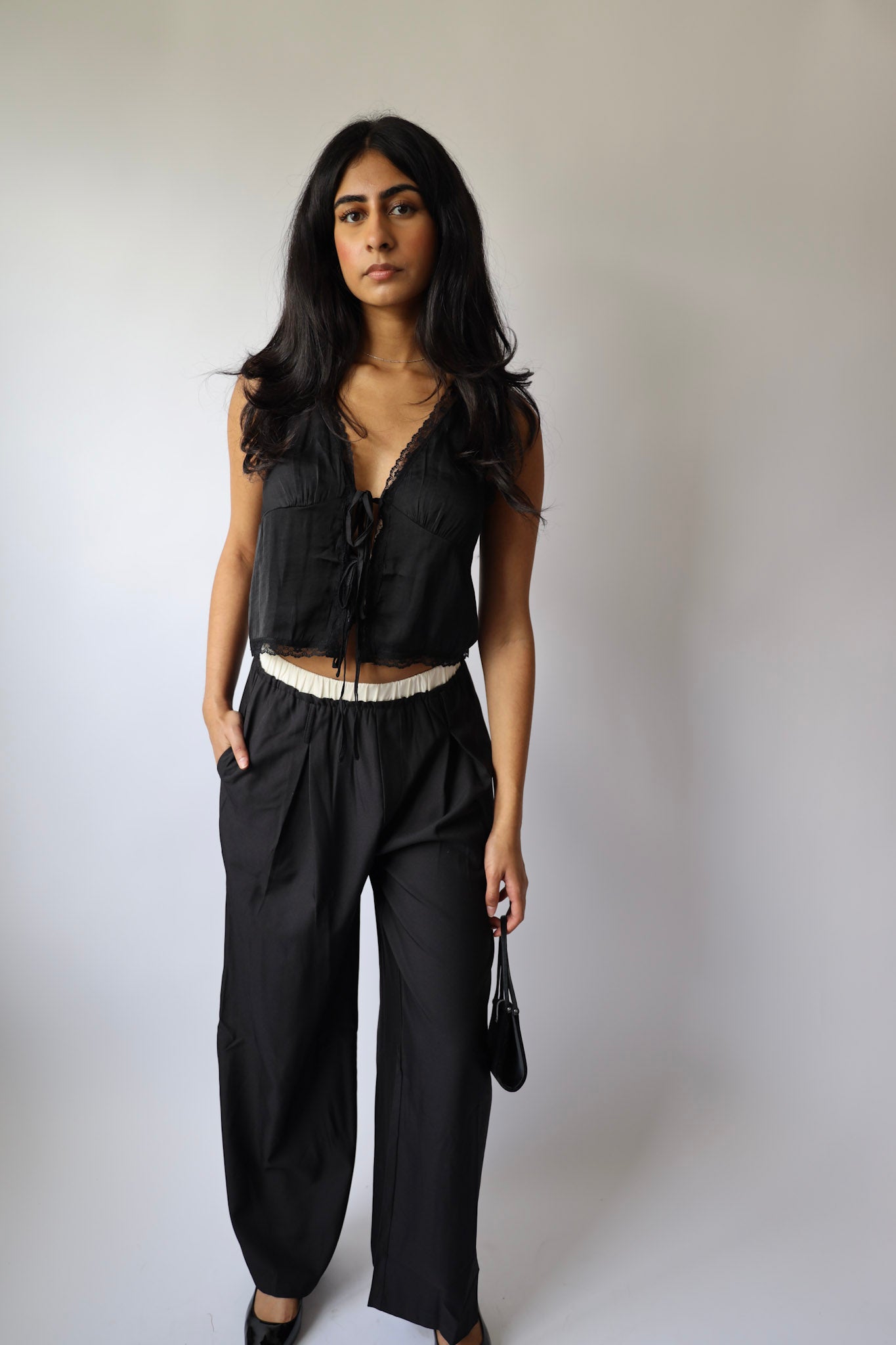 Get edgy with these Contrast Waist Wide Leg Trouser Pants. Featuring a contrast waist with elastic and belt loops, they offer a comfortable stretch and trendy pleated detail. Perfect for both work and streetwear, these pants also have hidden side seam pockets and a clean hem for a versatile night out look.