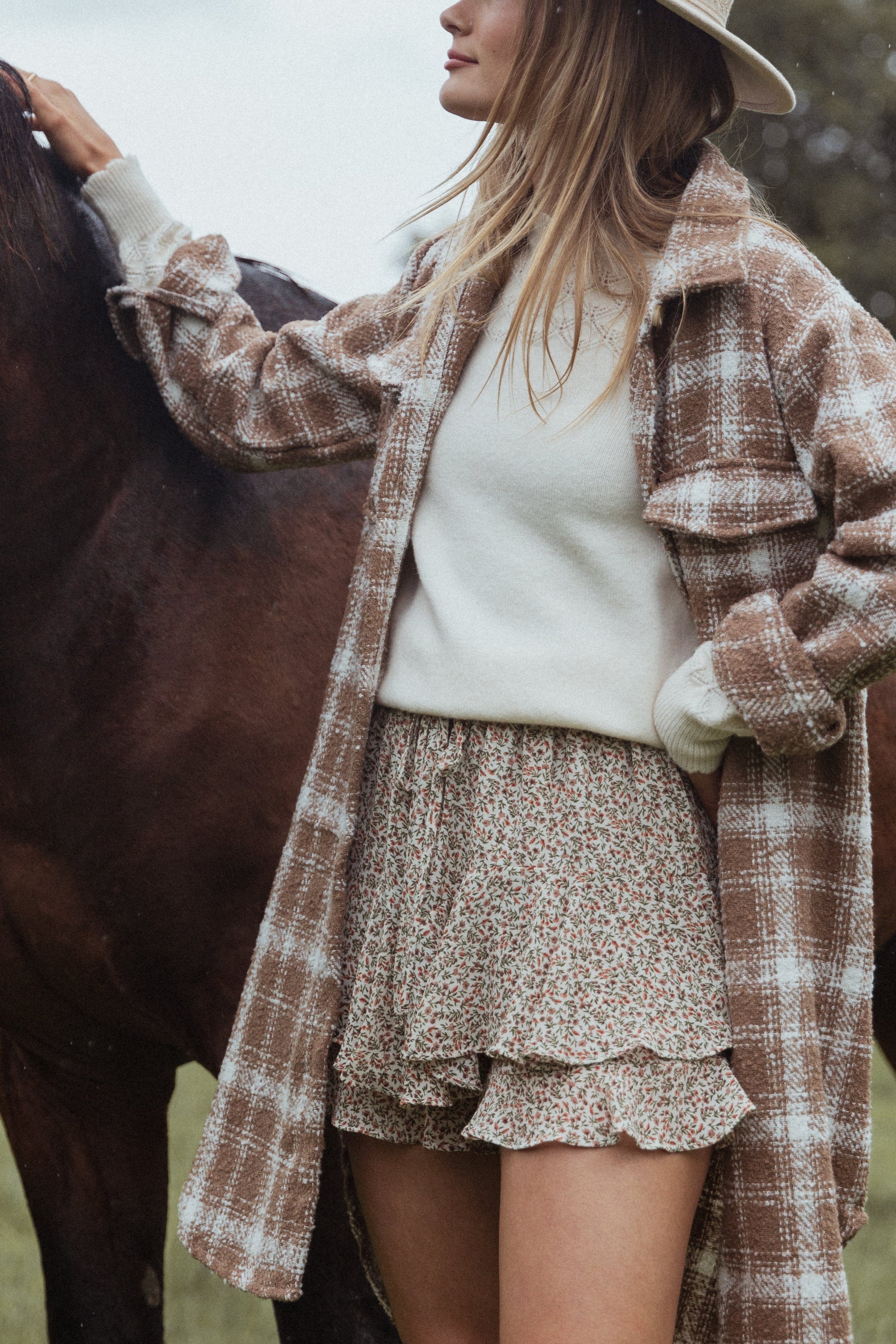 DETAILS Designed for those who love effortless elegance. The pull-on style offers easy wearability, while the tiered ruffle hem adds a playful touch that moves beautifully with every step. Adorned with a delicate floral print, this skort effortlessly captures the essence of modern femininity.